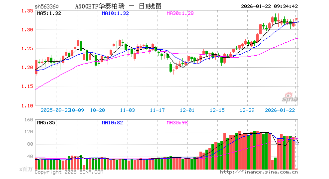 1月22日,A500ETF华泰柏瑞(563360)开盘涨0.46%,报1.324元。A500ETF华泰柏瑞(563360)重仓股方面,宁德时代开盘涨0.35%,贵州茅台涨0.07%,中国平安涨0.43%,招商银行涨0.08%,紫金矿业跌1.65%,美的集团涨0.60%,新易盛涨0.12%,中际旭创涨1.41%,东方财富涨0.00%,长江电力涨0.00%。