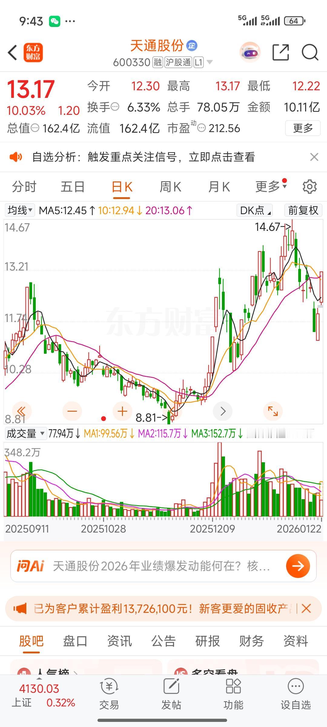 我去,兄弟们,这啥情况啊?啥情况啊?今天天通股份一开盘就高开,接着迅速拉升,还不到半个小时,现在直接涨停了。主力太狠、太狡猾啦,现在回头看,那次出年报预亏就是最后的打压、最后的洗盘啊。幸亏咱们坚持下来了,兄弟姐妹们,为咱们的坚持点个赞,晚上值得喝杯好酒庆祝庆祝。目前只是微亏,再来一个涨停就要盈利了。 你们坚持了吗?