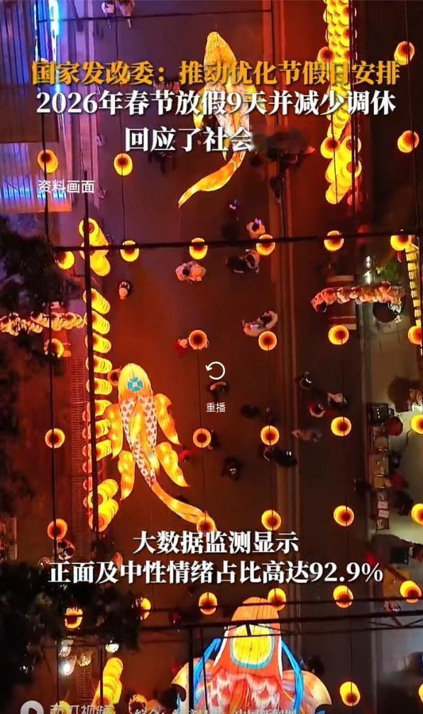 今年春节假期堪称史上最长假期,有九天; 国家发改委表示也是吸收了很多专家代表的意见,认真分析研判,积极推动优化节假日安排, 不但回应了社会期待,也增强了人民群众的节日获得感与幸福感。 大数据监测显示,正面及中性情绪占比达到92.9%”。说明绝大多数人民群众对于春节放假安排是满意的。 也有网友质疑今年春节假期还是有节前节后两个周六要补班,怎么算不调休;这里面可能就有个误解。 更准确的官方表述是 “减少调休” 或者 “优化调休”。2026年春节假期实际上就是通过小幅度的调休,实现了假期天数的延长和体验的优化。 为什么说这是一种“优化”?主要有两点: 调休幅度确实减少了:相比以前需要调休更多天数才能凑出长假的做法,已经在很大程度上减少了补班的天数。 避免了“超长工作周”:根据新的放假原则,法定节假日前后连续工作一般不超过6天。这次安排在春节假期后,不会出现连续上班超过7天的极端情况,避免了节后的极度疲惫感。 所以说,这次国家假日办真的的是用心了,倾听了群众的呼声,的确在优化调休,相信在26年的假日优化调整会越来越好,最理想就是没有调休,直接增加假日! 大家对于26年的假日有什么期待,评论区可以打出来,也祝福大家新年心想事成!