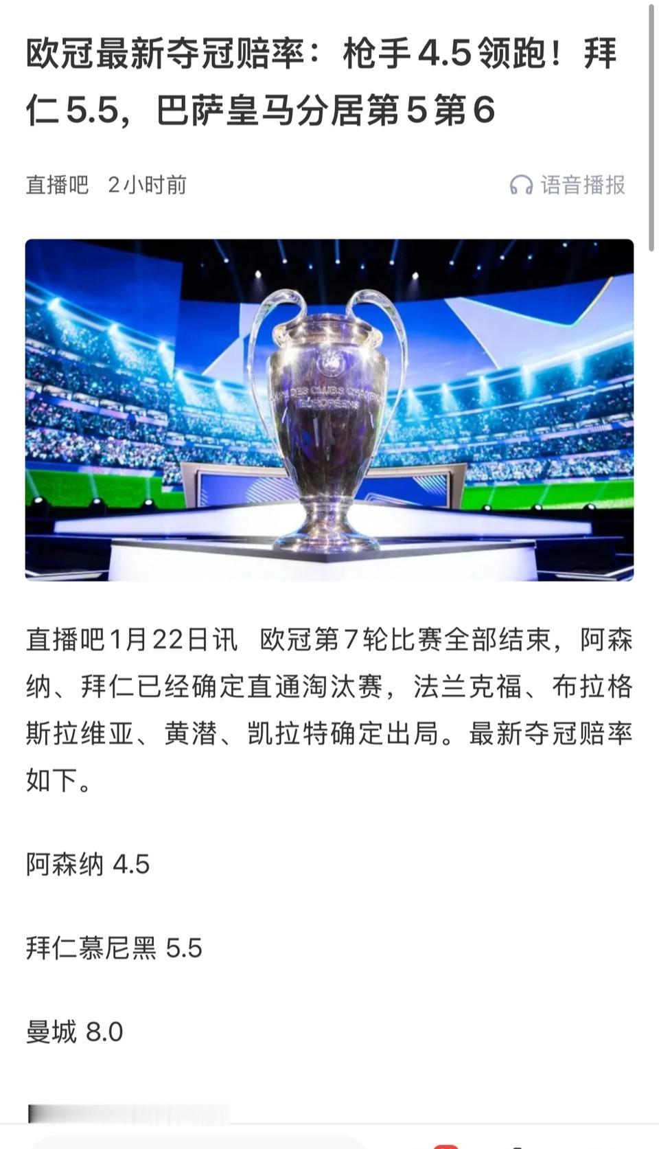 欧冠积分和赔率,两大豪门夺冠希望最大。 阿森纳是最强球队,有机会四冠王? 拜仁肯定拿德甲,争取三冠王。 皇马在西甲只落后巴萨1分,都有机会。 大巴黎,曼城,利物浦尊重一下。[呲牙] 我认为阿森纳,拜仁会师决赛。[大金牙]