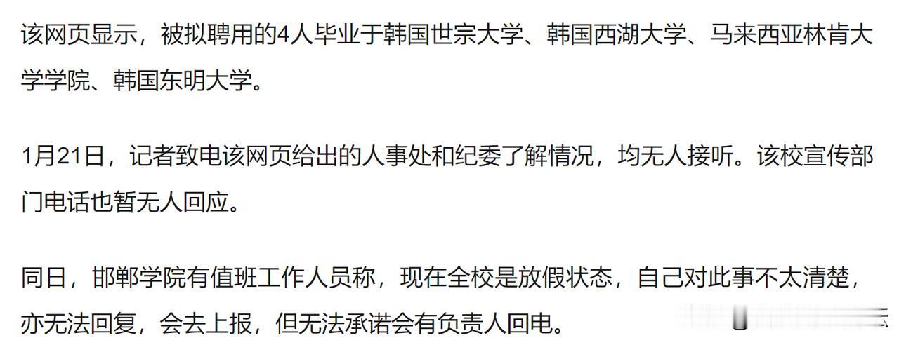 邯郸学院那个事情现在风头过了,就没事了,放假了电话也不接了,公示过了也删了。 但是这个回应的好,凑巧,只有10个人面试。 不知道是我们身边就业压力大是假的不,公办二本院校带编制的岗位,竟然只有10个人去面试。那么多去考社区,考劳务派遣的,看来还是不知道招聘的门道。