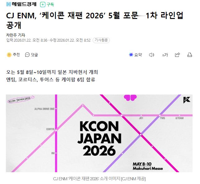 《KCON JAPAN 2026》首轮出演阵容公开22日CJ ENM方面表示将于5月8日~10日将在日本千叶县举行《KCON JAPAN 2026》。同时CJ ENM方面也公开了《KCON JAPAN 2026》的首轮出演阵容:首组在韩国和日本达成百万销量的日本艺人&TEAM,通过出道专辑《EUPHORIA》创下初动百万销量的ALPHA DRIVE ONE,凭借出道专辑《COLOR OUTSIDE THE LINES》登上美国Billboard 200榜单15位的CORTIS,《THE WINTER MAGIC》发行4天便达成百万销量的INI,作为日本艺人首次入围美国《2026 I-Heart Radio Music Awards》候选名单的JO1,获得Oricon年度“新人榜单”2位的TWS。除此之外,更多的艺人阵容将在之后公开。