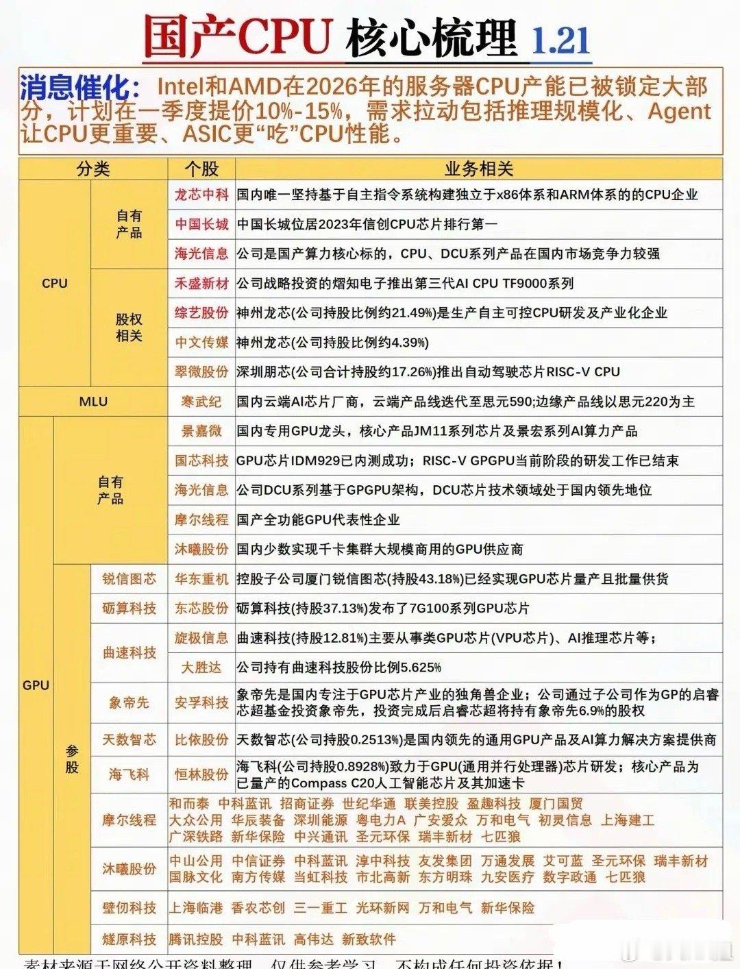 国产CPU突发利好!七大唯一性龙头梳理1月21日消息,Intel和AMD计划2026年一季度服务器CPU提价10%-15%,叠加算力需求陡增,国产CPU国产替代提速,迎来双重红利。七大唯一性龙头标的如下:1. 龙芯中科:国产CPU自主可控核心龙头,唯一实现指令集到芯片全流程自主可控的企业,LoongArch架构100%自研,摆脱海外技术依赖。2. 海光信息:高性能算力主力,国内唯一x86架构CPU量产企业,也是唯一DCU(数据中心单元)设计厂商,生态兼容性强。3. 中国长城:党政市场市占率第一,旗下飞腾CPU覆盖全场景,与麒麟软件构建“芯片-整机-系统”生态,信创领域核心标的。4. 北京君正:嵌入式CPU设计市占率国内第一,MIPS架构自主研发,“CPU+存储”协同优势显著,聚焦车载、工业等领域。5. 国芯科技:嵌入式CPU IP核绝对龙头,拥有40余款自主CPU内核,军工、工业领域壁垒高,客户粘性强。6. 澜起科技:内存接口芯片全球龙头,DDR5产品市占超30%,是服务器CPU配套核心,AI服务器增量需求直接受益。7. 卓易信息:国产CPU平台唯一大规模互测企业,PCIe Switch/Retimer产品为AI服务器通道扩展刚需。注:以上基于公开信息整理,不构成任何投资建议。理财有风险,投资需谨慎。祝大家马年踏准节奏,精准布局,持仓日日飘红,财源广进!