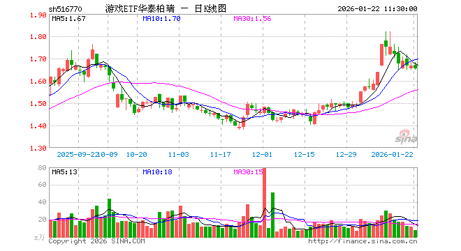 1月22日,截止午间收盘,游戏ETF华泰柏瑞(516770)跌0.78%,报1.654元,成交额1296.84万元。游戏ETF华泰柏瑞(516770)重仓股方面,巨人网络截止午盘跌2.88%,恺英网络跌1.92%,三七互娱跌0.92%,光线传媒涨0.89%,神州泰岳跌0.16%,完美世界跌1.34%,吉比特跌1.16%,掌趣科技涨0.34%,顺网科技涨0.92%,浙数文化涨0.40%。