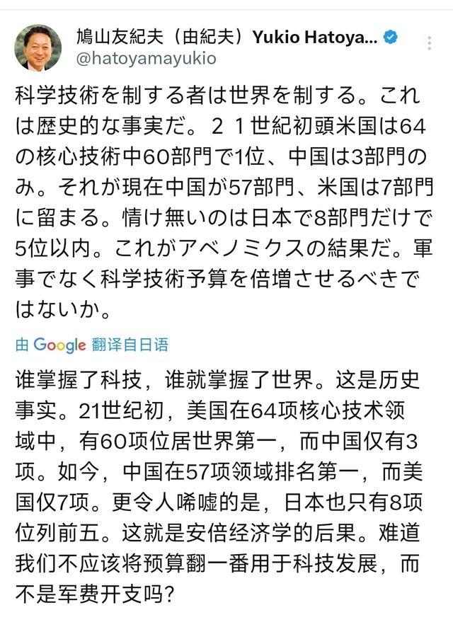 鸠山由纪夫发声了,直接给日本指出了明路!1月20日,日本前首相鸠山由纪夫发文:“谁掌握了科技,谁就掌握了世界。这是历史事实。如今,中国在57项领域排名第一,而美国仅7项。更令人唏嘘的是,日本也只有8项位列前五。难道我们不应该将预算翻一番用于科技发展,而不是军费开支吗?” 鸠山由纪夫这回发帖,点名科技才是王道。他拿ASPI的报告说事,意思是历史证明,谁科技牛,谁就牛遍天下。中国现在在57个关键领域排第一,美国就7个,日本在前五里才8个。这数据不是胡来的,澳大利亚战略政策研究所的报告显示,21世纪初美国垄断60多项核心技术,现在中国翻盘领先57项。这让日本得好好想想,钱该往哪砸。鸠山的意思明摆着,日本别老盯着军费涨啊涨的,与其搞军备,不如多投科技研发。毕竟,二战后国际社会给日本套了枷锁,就是防它再犯老毛病。可现在军费年年加,周边国家都警惕起来了。中国已经管制对日出口军民两用东西,这直接卡住日本一些产业脖子,经济上吃亏不小。 要解除这些管制,日本得自力更生,猛推科技和经济,少靠别人。鸠山没直说,但大家懂的,日本人口老龄化严重,劳动力缩水,养老压力大,这时候还猛加军费,等于自找麻烦。中国在人口和资源上占优,日本想追赶,谈何容易。鸠山这话说白了,就是提醒日本醒醒,别一条路走到黑。科技投资能带来实打实的竞争力,军费扩张只会惹来更多对立。看看数据,日本在AI、机器人这些领域,本来有优势,但现在中国全面超车,日本经济产业省的报告也承认,中国制造业增加值占全球三成,日本不到一成。新能源汽车中国销量全球六成多,日本才一成出头。5G基站中国占全球六成,日本就那么点。这些差距拉大,日本不调整,日子难过。 鸠山发帖后,媒体转的到处都是,政界也议论纷纷。有些议员觉得有理,建议改预算,但政府咬牙坚持,把军费推到GDP的2%。企业那边,半导体和精密仪器供应链被中国管制卡住,库存见底,生产线上乱套,损失算下来不少。经济专家们开会分析,说这会拖累日本整体竞争力。同时,人口老龄化加剧,年轻人少,养老开支猛涨,科技研发的钱就更挤了。鸠山后来在采访里又提,日本得直面这些难题,先抓科技自立。 鸠山的目的很简单,让日本看清现实,别再错下去。要是继续扩军,内外压力会更大,经济堵塞,关系恶化,日本自己会陷泥潭。想想历史,日本技术立国曾经风光无限,索尼、东芝啥的全球称霸,可现在中国华为、小米崛起,日本企业变供应商。东京大学民调显示,大半日本人觉得中国科技领先是压力,这心态得调整。军费占GDP超2%,东海南海活动频频,这不帮着缓解,还添乱。鸠山这种老政客发声,值不值得听?日本高层要是无视,后果自负。 日本现在面临的选择,其实是科技自强还是军备依赖。鸠山用数据戳破泡沫,提醒大家别走弯路。中国科技领先不是新闻,但日本怎么应对,才是关键。国际社会盯着呢,日本一意孤行,只会自食苦果。