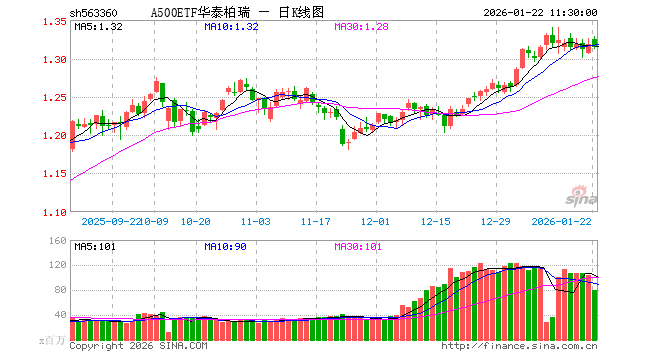 1月22日,截止午间收盘,A500ETF华泰柏瑞(563360)跌0.30%,报1.314元,成交额105.15亿元。A500ETF华泰柏瑞(563360)重仓股方面,宁德时代截止午盘跌2.80%,贵州茅台跌0.30%,中国平安跌1.47%,招商银行跌0.94%,紫金矿业跌2.31%,美的集团跌0.03%,新易盛跌0.14%,中际旭创涨1.11%,东方财富跌0.13%,长江电力跌0.71%。