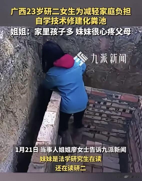 “广西北海这位研二法学女大学生火了!”据媒体报道,她放假刚到家,得知家里化粪池塌陷堵塞,心疼父母操劳,想为家里减轻负担,便二话不说上手干活,靠着短视频自学技术,独自动手给家里修建化粪池,这一幕被姐姐拍下分享后,瞬间引发全网热议! 姐姐还透露,妹妹向来懂事,家里孩子多,她不仅帮家里装电灯,还曾帮舅舅装修房子,读书干活样样行。 对于女孩的举动,网友纷纷点赞:“这才是高材生的样子,有知识更有担当”! 也有网友称赞:“学霸的动手能力也太绝了,孝顺又能干,活该优秀”! 在周少看来,这位女生的举动,远比单纯的“学霸光环”更有教育意义。 当下不少年轻人成了“手不能提肩不能扛”的书呆子,而她却将读书的思辨能力转化为动手能力,更难能可贵的是那份刻在骨子里的孝顺与担当。 她懂得体谅父母的不易,把对家人的爱落到实处,这正是最鲜活的成长教育。 真正的优秀,从来不是只会读书的高分,而是兼具学识、能力与感恩之心,能扛起责任、体谅他人,这样的孩子,才是家庭教育最成功的模样,也值得所有年轻人学习!#寻美三湘# #长沙新朋友#