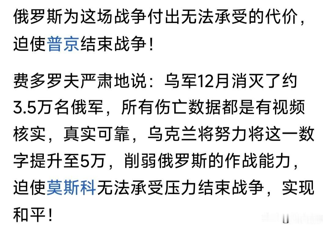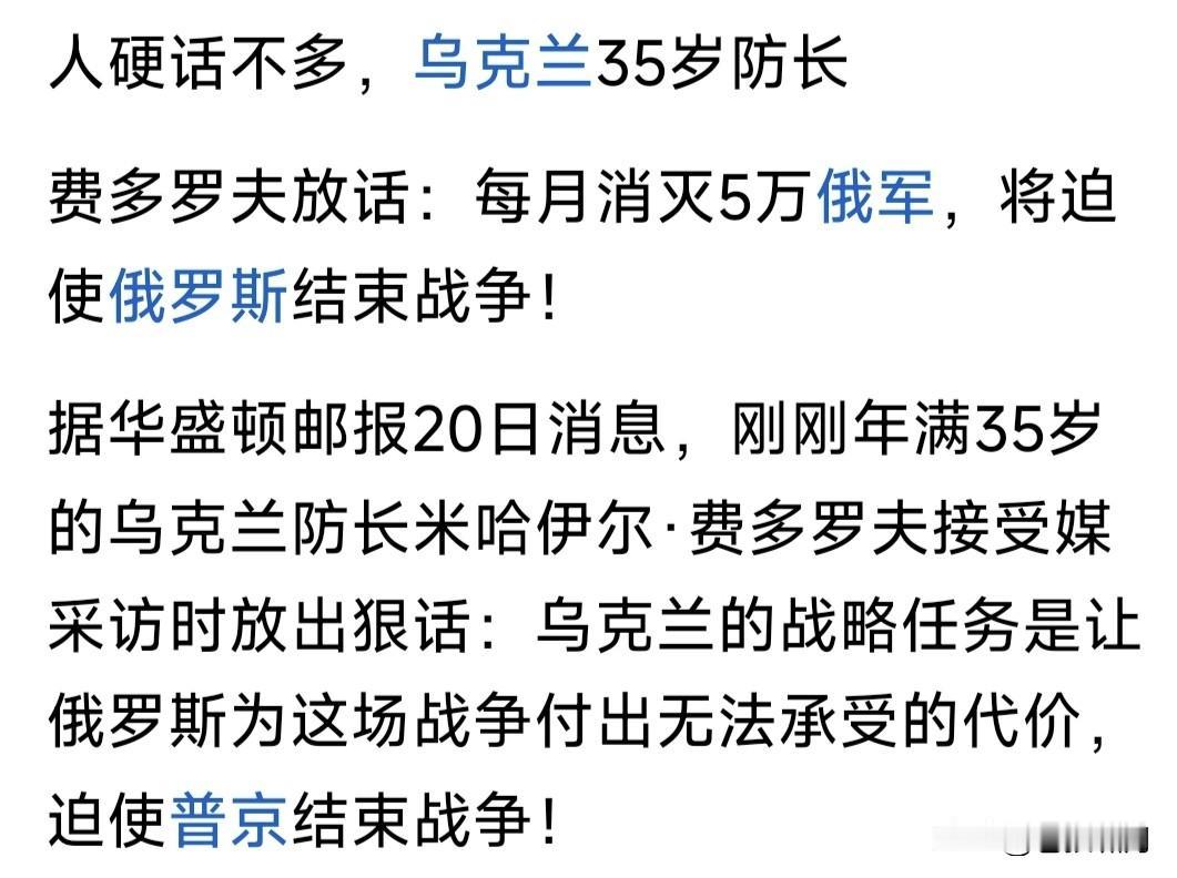 乌35岁防长够狠够硬!他对媒体放话:乌已制定战略目标,每月将消灭5万俄军,让俄承受不住,同意结束战争! 这位新防长精通科技,尤其是无人机专家!他说这话是心里有数?还是恐吓对方?他说2025年12月,乌军消灭3.5万俄军,2026年要把数字提高到5万! 关键是让俄军每月伤亡5万,那乌军准备伤亡多少?希尔斯基说去年乌俄伤亡比例是1:6,就是不到1万?觉得这个比例有水分!应该是1:3合乎情理吧? 即便如此,每伤亡俄军5万,乌军也得付出2万人代价!按照乌俄人口基数差距,也够乌承受了!能挺得住吗? 战争无赢家,双方都是损耗!为何要有这场战争?目标能实现吗?还是放下执念,及早停战。不然贻害无穷啊! …………