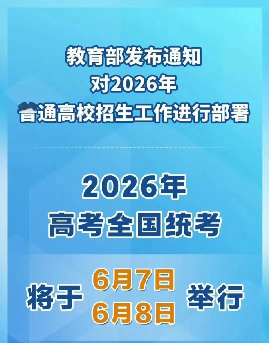 2026年高考时间确定了,依旧是6月7日、8日。这时间如同一位老友,每年都如约而至。高考,向来是千军万马过独木桥。 我当年参加高考时,考前紧张至极,每一分钟都好似在倒数。考场外,家长们翘首以盼,那场景至今仍历历在目。对考生而言,这两天宛如命运的关键转折点。每一场考试,都是知识与心态的双重考验。 期望2026年的考生能调整好状态,在这两天发挥出最佳水准,都能考上心仪的大学。高考加油!