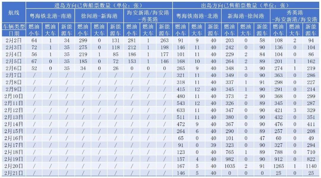1月21日,琼州海峡客滚运输共发送航班252班次,运输旅客57773人次、车辆16792辆次。