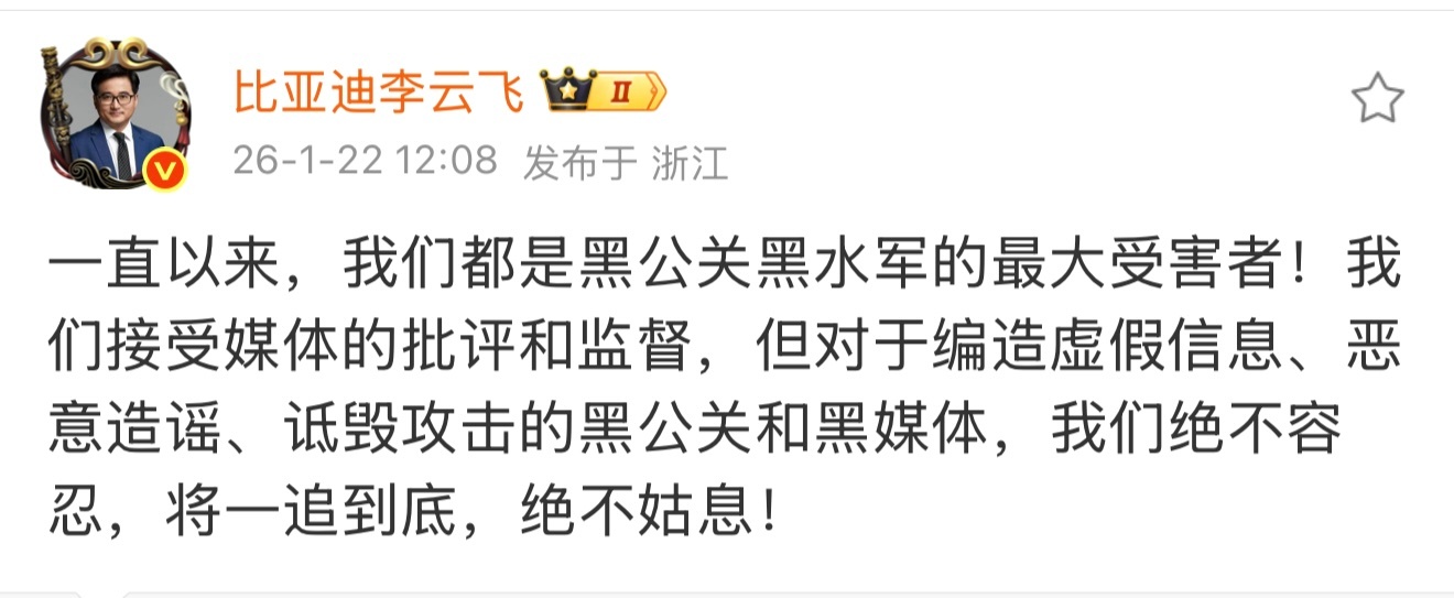 比亚迪法务部刚官宣,起诉抖音博主“大秦军陕团”的案子一审有结果了。法院认定编造传播方程豹汽车的虚假信息,损害品牌声誉,判赔201万。能看出比亚迪对造谣抹黑的态度非常明确。也算给行业提了醒。你觉得这种判罚能减少行业乱象吗?【比亚迪起诉博主获赔201万高管称比亚迪是黑公关最大受害者】
