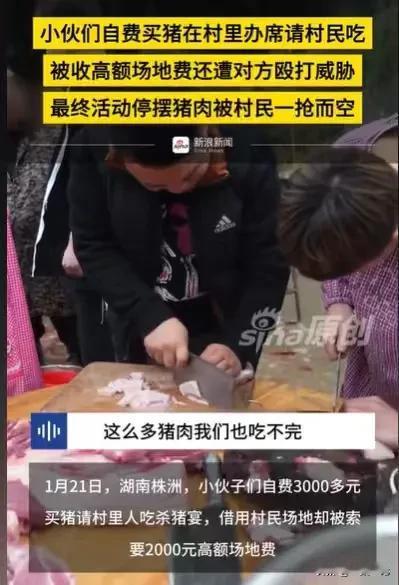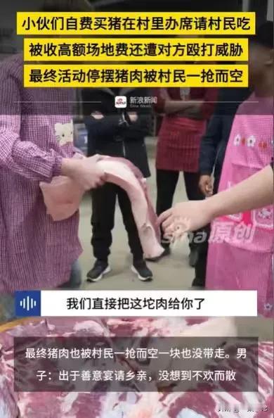 湖南株洲,几个小伙花了3240元买了一头猪,他们要在村里办年猪宴,免费请村民们吃,村民们却不领情,不但要小伙们给2000元的场地费,就连水,柴火,打扫卫生都要收钱,小伙们的杀猪宴办不成了,最后还遭到村民的殴打威胁,猪肉也被一抢而空,小伙们不得不支付1200元,才得以离开了村子。 几个小伙,提前回家过年,非常想感受一下年猪宴的气氛,他们想热热闹闹地感受年味。 要办年猪宴,那就得有一个大场地,有很多人参加,这样才热热闹闹的,这样才有气派。 小伙们考虑到,村里的独居老人比较多,子女都不在家,平时也没有个年轻人出现在他们的生活里,他们的生活没有朝气。 他们决定请这些独居老人,还有村民们,一起热热闹闹地感受年味,于是他们凑钱买了一头猪,3240元,那是一头大肥猪。 这么大一头猪,单单村里的几个老人,肯定是吃不完的,要村民们一起吃才热闹,他们干脆见者有份,只要来参加,就可以免费吃猪肉。 可这么大一头猪,要做成菜,办一场年猪宴,场地要比较大,才能容纳这么多人,现场的氛围才够喧闹。 他们来到一户村民家,这一户村民他们的场地比较大,在他们的场地上,可以轻轻松松地办一个年猪宴。 小伙们都已经想好了,就用这户村民的场地办年猪宴,到时候再给他们一大块猪肉作为感激。 考虑好一切,猪也买了,他们的年猪宴要开始了。 万事开头难,他们的年猪宴却迟迟办不成,他们的场地都没有谈好。 他们选定的场地,村民不愿意免费给他们使用,他们狮子大开口,张嘴就要2000元的场地费。 除此之外,柴火,水,打扫卫生,这些都要钱。 当这几个小伙听到村民们说,场地要2000元的费用,他们也是愣住了,他们是真没想到,他们是免费请村民们吃年猪宴,结果村民们却要场地费,而且是高额场地费。 如果给了这笔场地费,他们办的这个年猪宴的成本就太高了,他们可办不起啊。 他们免费给村民们吃猪肉,免费请大家参加年猪宴,村民们却如此斤斤计较,小伙们心寒了,也不想继续这个活动了,他们想停止活动。 可事情已经由不得他们了,有村民嚣张地喊道:“办不起,就不要办。” 说着还有村民过来要殴打小伙们,小伙们被吓到了,没想到好心请村民们吃年猪宴,结果闹成这般,他们的活动也进行不下去了。 可他们不能说走就走,即使办不成,他们也要把猪肉的3240元支付了,他们还要支付场地费1200元,如果不支付这些钱,他们是走不了的。 当时,就有一个村民已经向他们大声喊道,要单挑。 看着村民们来势汹汹,小伙们支付了3240元的猪肉费用,又支付了没有使用的场地费1200元,这才得以离开。 好心宴请村民们吃杀猪宴,结果双方闹得不欢而散,小伙们还被威胁殴打,有了这样的经历,或许他们再也不敢做这样的好事了。 那么如何认定这样的事情呢? 首先,小伙们要使用村民的场地,村民要收场地费,这并不违法。 《民法典》第207条规定:国家、集体、私人的物权和其他权利人的物权受法律平等保护,任何组织或者个人不得侵犯。 场地属于村民们的个人合法财产,他们有权支配自己的场地。 其次,村民威胁殴打小伙们,这就违法了。 《治安管理处罚法》第43条规定:殴打他人的,或者故意伤害他人身体的,处五日以上十日以下拘留,并处二百元以上五百元以下罚款;情节较轻的,处五日以下拘留或者五百元以下罚款。 虽然年猪宴办不成,村民拒绝小伙们就可以了,没必要闹得不愉快。 最后猪肉被村民们一抢而空,这属于哄抢行为。 《治安管理处罚法》第49条规定:哄抢公私财物的,处五日以上十日以下拘留,可以并处五百元以下罚款;情节较重的,处十日以上十五日以下拘留,可以并处一千元以下罚款。 虽然小伙们一开始是免费请村民们吃猪肉的,但是杀猪宴办不成,他们也有权支配自己的猪肉,村民们哄抢就属于违法行为了。 那么你对他们的行为有何看法呢?