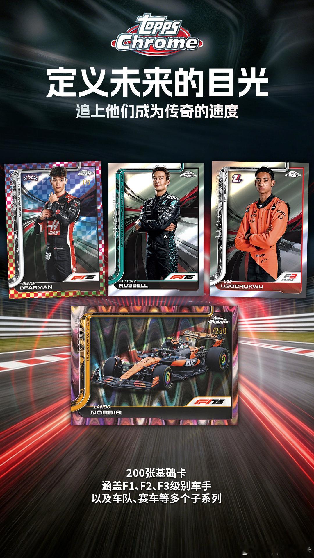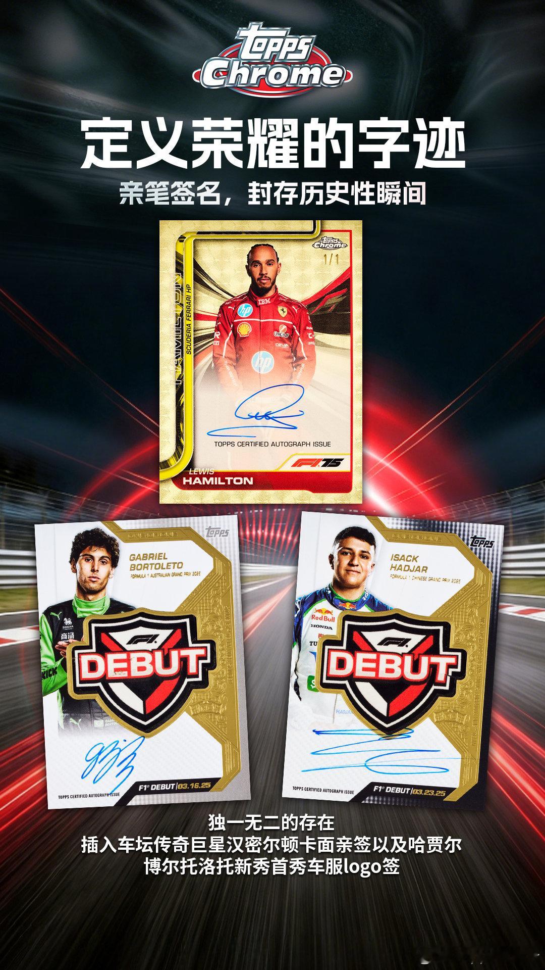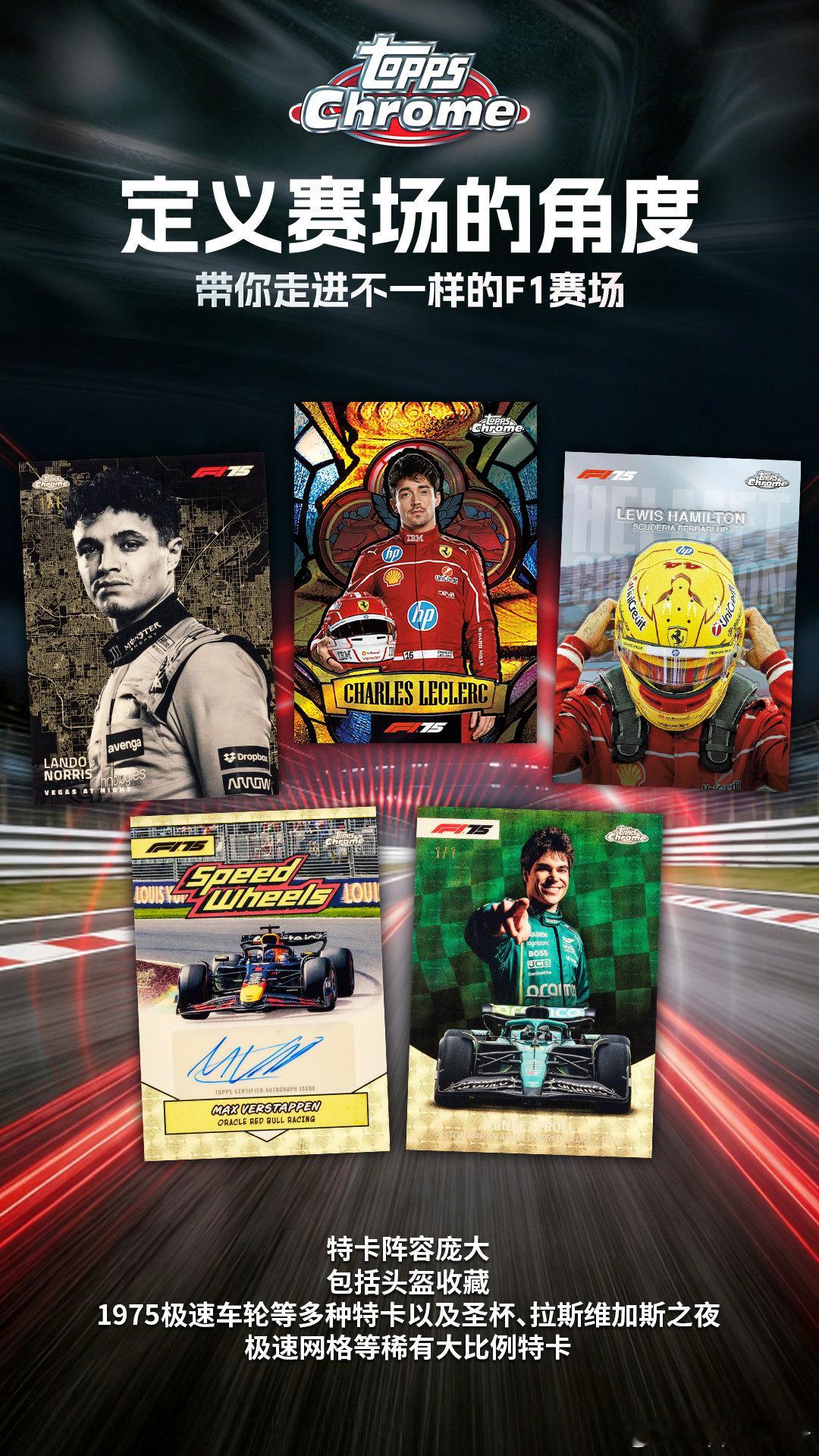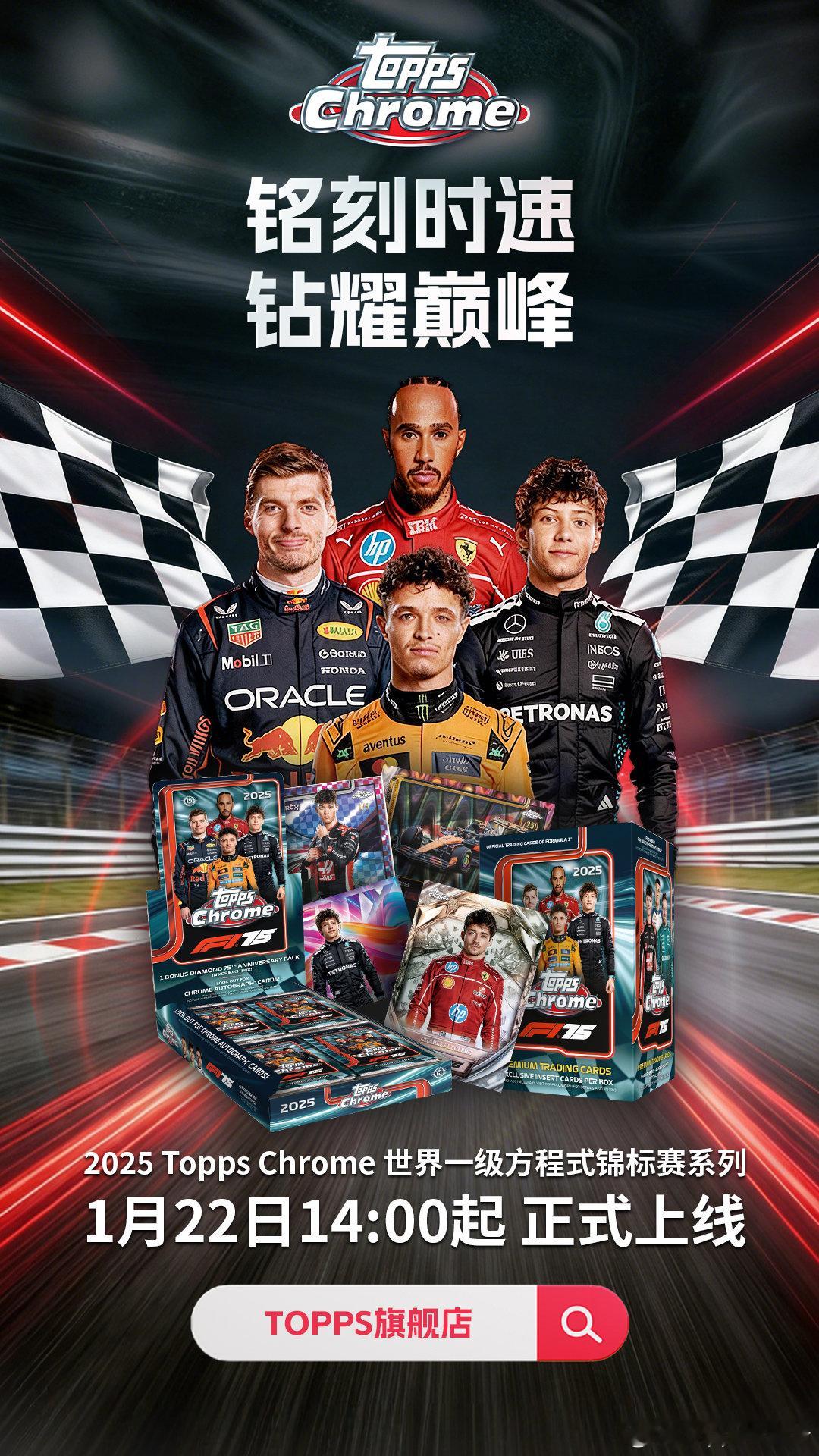 【铭刻时速,钻耀巅峰】2025 Topps Chrome F1系列,正式上线!点燃引擎,急速前行,重新定义“珍藏”的意义。💎钻石,铭刻75载轰鸣不只是收藏,更是致敬。每盒Hobby版将附赠75周年专属纪念包,包含4张钻石纪念卡,还有机会拆出钻石实物卡。👑传奇与未来,在此一举庞大的新秀阵容名单,网罗F1、F2以及F3各级别车手,包括传奇车手、车队、赛车等多种子系列。✍️独一无二,缔结浪漫连结与七冠王汉密尔顿的卡面亲签相遇,触摸新秀哈贾尔与博尔托洛托的首秀勋章签字卡,这些独一无二的瞬间,等你来发现。🎨多维视角,看见不一样的F1赛场经典的「头盔收藏」、全新的「1975极速之轮」以及「拉斯维加斯之夜」等多种特卡带你全方位看F1,更有圣杯特卡收藏玩法上线。⏰1月22日14:00上TOPPS旗舰店,开启你的指尖赛道!Topps F1 ToppsChromeF1系列