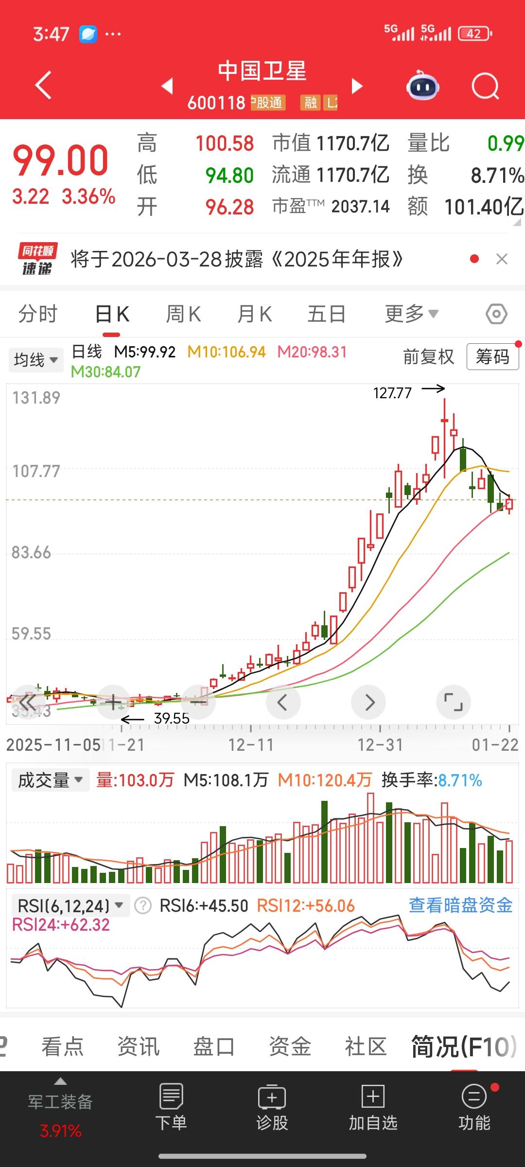 作为近期最热门的主流概念板块,商业航天、航空航天领域,我们只需关注卫星ETF,或是行业龙头中国卫星。目前,中国卫星回调至20天线,短期似有止跌迹象,今日拉出一根中阳线。但现在还不能判定已成功探底,也不能说马上就会反转。 我认为它还需在此处整固两三天,若能持续收出小阳线向上,短期内止跌应是大概率事件。这意味着商业航空航天板块基本也能在此止跌,并迎来较大幅度的反弹。不过,是否会开启第二浪行情,目前实在难以断言。除非在接下来春节前有更强有力的政策刺激或重大消息推动,否则还是以反弹行情看待。 我觉得可以趁着商业航空航天板块反弹,边反弹边减仓。 航空航天板块 航天概念股 航天发展股票 航空航天股 商业航天低价股 中国卫星行业 航天航空概念股