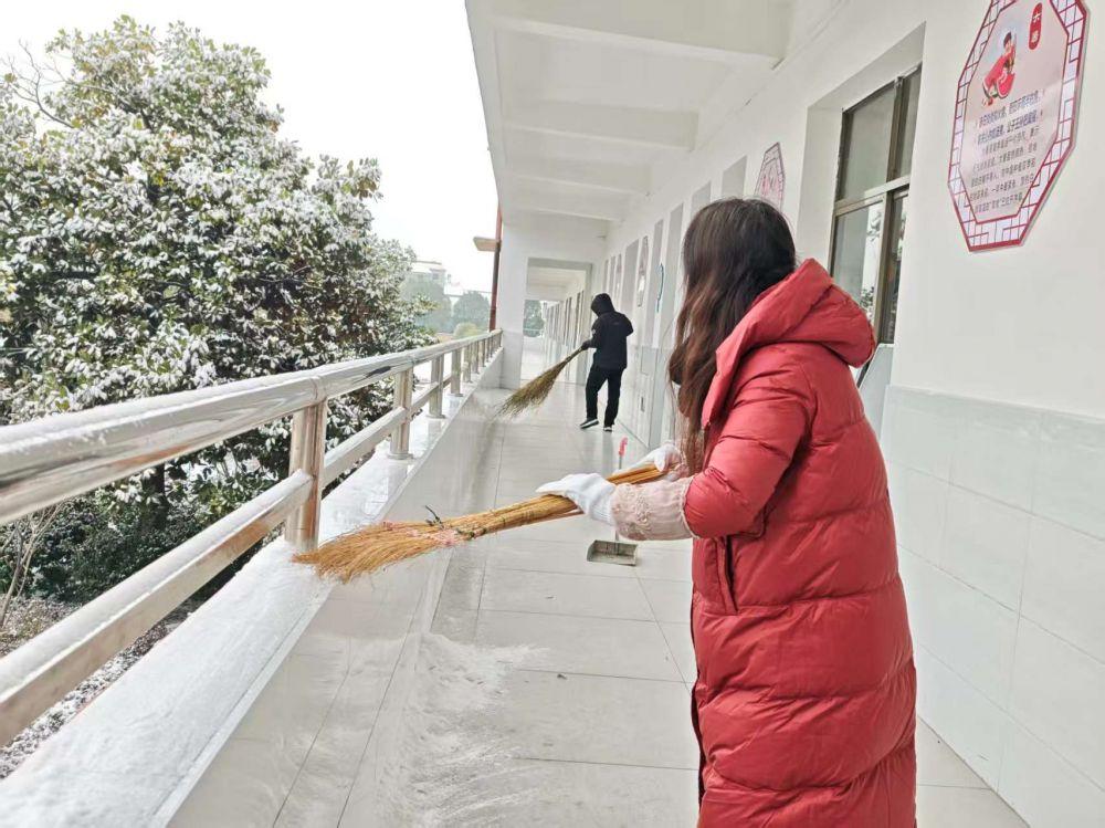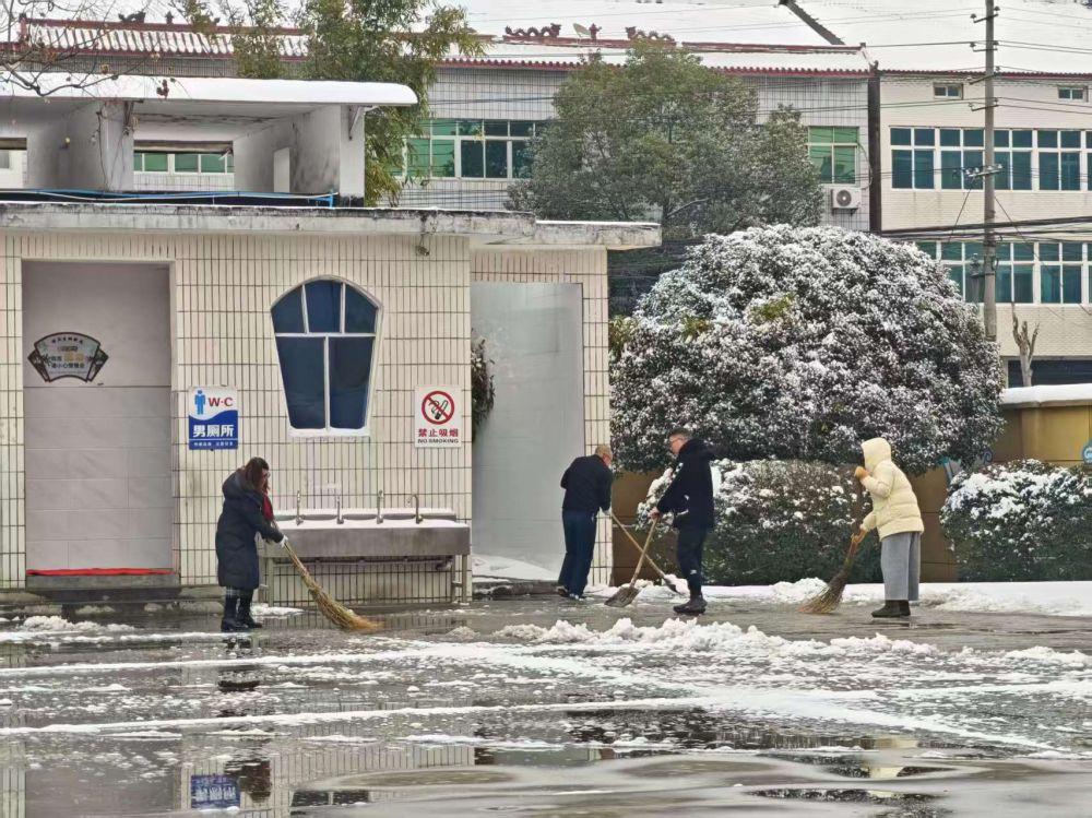 停课不停责,关爱不缺位。为尽快消除积雪隐患,保障学生早日安全返校,学校当日清晨发出扫雪倡议,家住附近可步行抵达的教师积极响应,自带铁锹、扫帚等工具赶赴校园。尽管室外气温跌破零度,老师们不畏严寒、分工协作:年轻教师奋力铲雪堆,年长教师细致扫残冰,行政后勤人员重点清理教学楼出入口、校门口等关键区域,现场热火朝天。