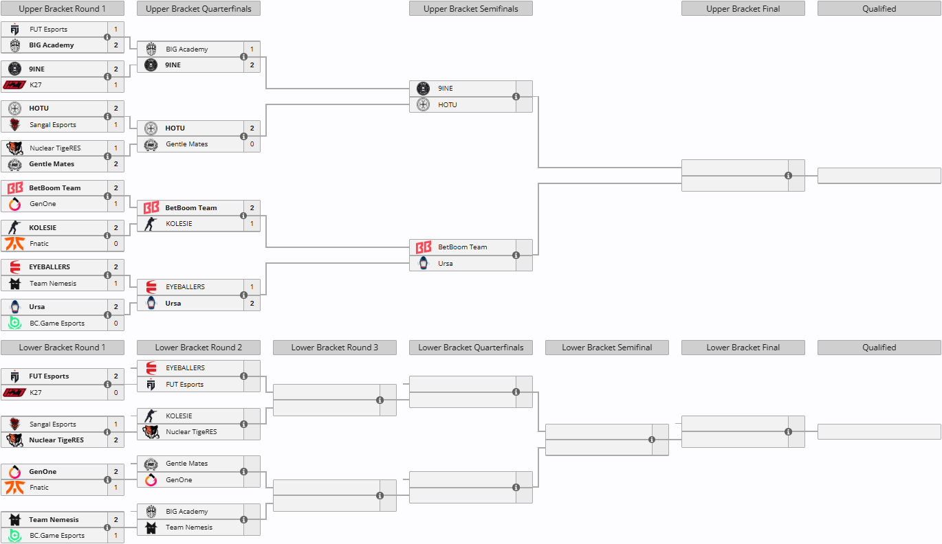 胜者组方面,9INE、HOTU、BB与Ursa取得两连胜,其中Uras作为递补参赛的黑马,接连爆冷击败BC.Game和JW领衔的EYEBALLERS。