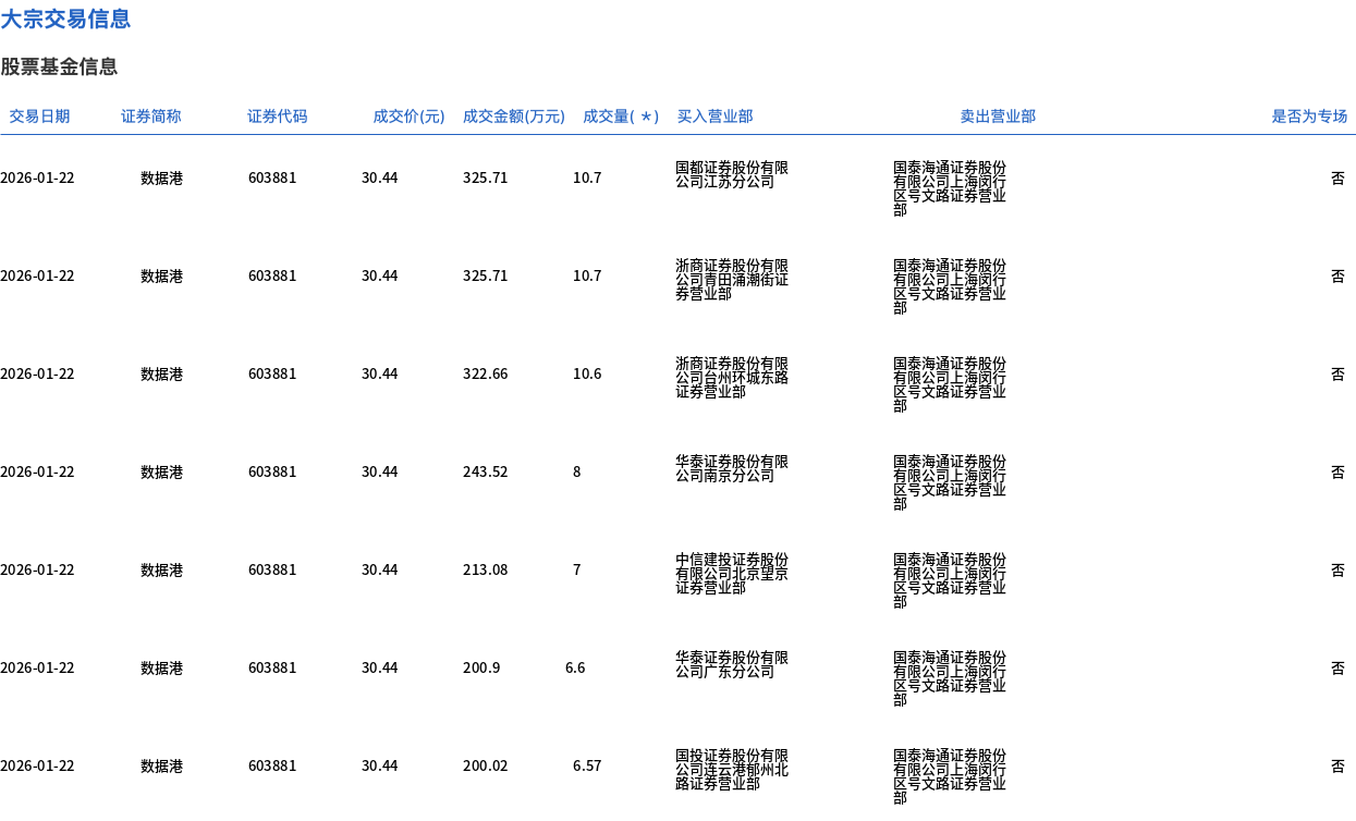 1月22日,数据港大宗交易成交60.17万股,成交额1831.6万元,占当日总成交额的1.37%,成交价30.44元,较市场收盘价34.55元折价11.9%。