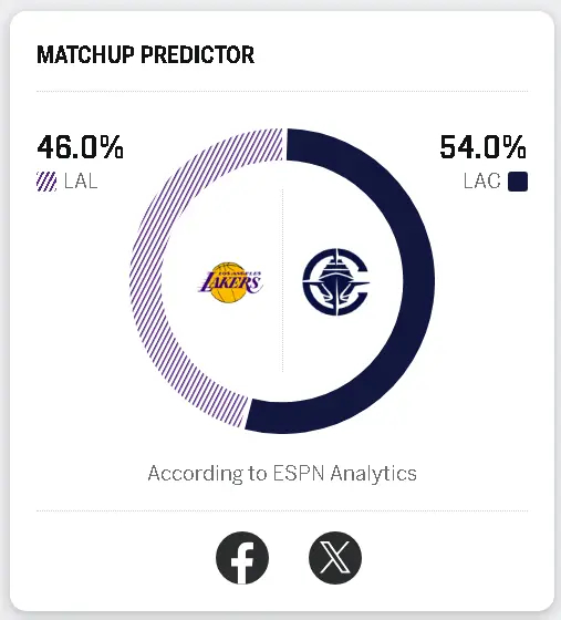 明日洛城德比,湖人八连客场第二场对阵快船,ESPN给出湖人胜率高达46%!湖人v