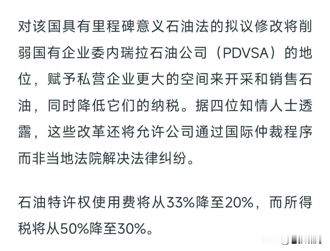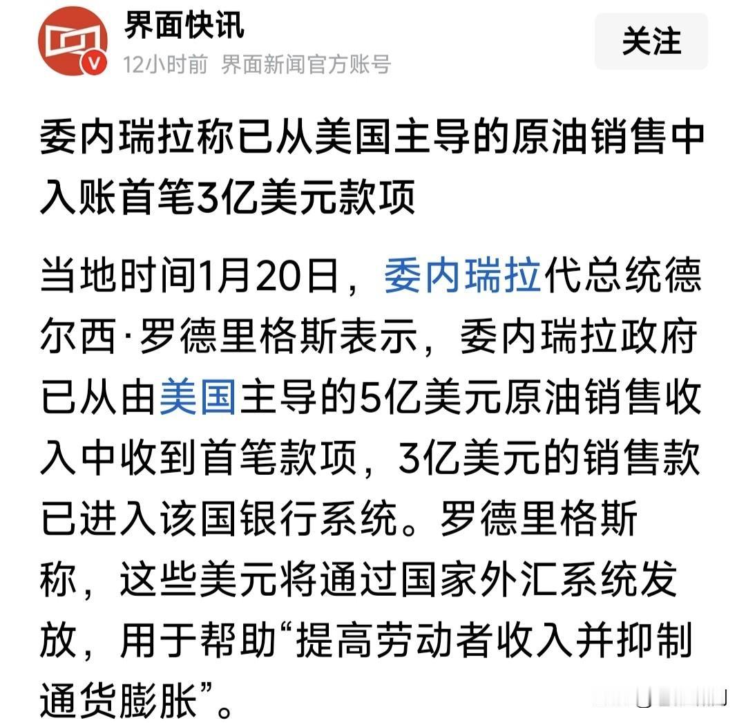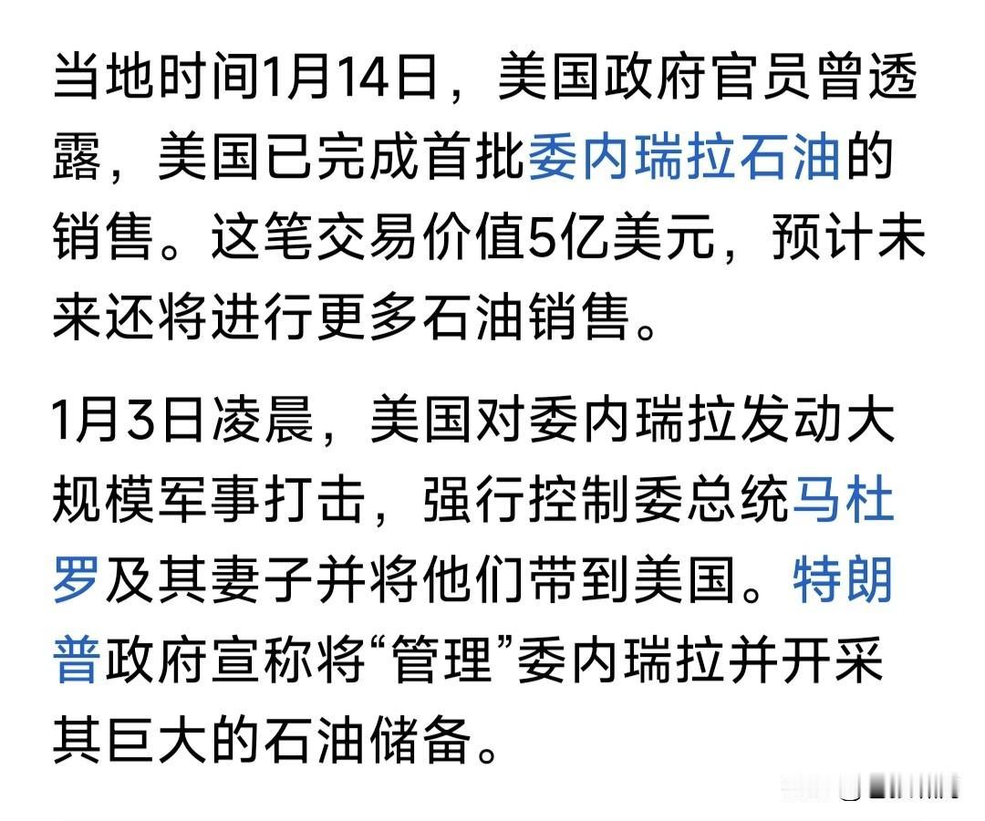 美国销售首批委内瑞拉石油,获利5亿美元。美国分成2亿,委分得3亿! 本人有点搞不懂:委内瑞拉石油,为何要由美国来卖,并且要两国分成? 委内瑞拉主权何在?美国不是硬抢吗?这次卖的石油,是扣押油船的吗? 扣押别国购买委的石油,美帝只是转手倒卖,就从中渔利40%?这不是典型的霸权欺凌主义?委内瑞拉也能忍? 你还别说,还真是忍了!不仅如此,还要对本国石油业进行改革:逐步把国有变为个人企业。不是拉历史倒车? 如果这样,就是对查韦斯与马杜罗的否定!委石油资源世界第一,曾是南美富国,两人将石油收归国有,很快把国家搞穷了!现在又回过头来走老路? 细想这个变化,是否美帝促成?以反毒为名,调动军队围堵,最后直接跨境突袭,抓捕刺头马杜罗!代总统服软,愿与美国搞好关系,共同开发石油! 都说川普不靠谱,但在委内瑞拉这件事上,却“一箭三雕”,拿捏恰到好处! 1.又扳倒一个“反美刺头国家”! 2.掌控委经济命脉“石油销售”,拒绝卖给“不喜欢国家”,只卖给“友好国家”! 3.自己不用开采,就获得大笔利润。 至于对委内瑞拉,好事还是还是坏事? 目前看是坏事,因为本国石油销售,要由老美主导,白白失去一笔收入。但话说回来,如果继续封锁不让你卖呢? 从长远着眼,对委或许是好事!查韦斯马杜罗把石油产业私营变国有,导致国家由富变穷!现在罗德里格斯再变回,把国有变私营,是否会由穷变富呢? 一切不可预测,一切皆有可能!想想米莱担任阿根廷总统后的改革,阿根廷现在的经济状况,是否能说明问题呢? …………