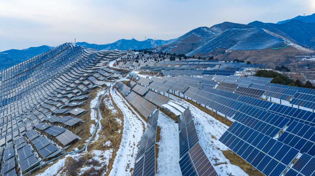 1月21日,在山西省运城市芮城县,光伏板在白雪映衬下熠熠生辉,美如画卷。