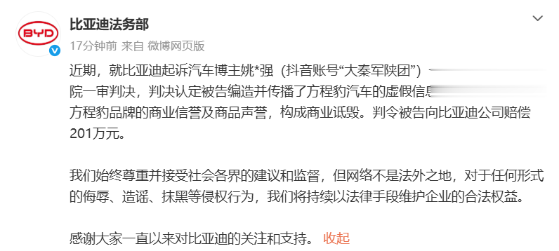 近期,就比亚迪起诉汽车博主姚*强(抖音账号“大秦军陕团”)一案,我司收到法院一审判决,判决认定被告编造并传播了方程豹汽车的虚假信息,损害了比亚迪及方程豹品牌的商业信誉及商品声誉,构成商业诋毁。判令被告向比亚迪公司赔偿201万元。