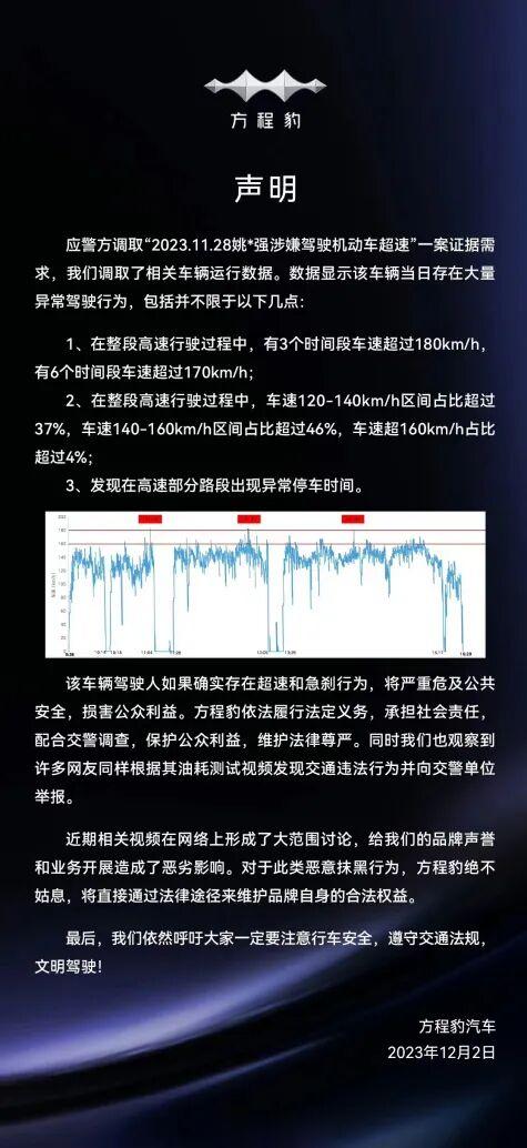 不过,2023年12月4日“大秦军陕团”在发布视频称,在乌海市某国道限速80公里/小时路段行驶速度达到103公里/小时,交警已经对此行为做出了罚款200元记3分的处罚。“没有在第一时间回应方程豹公司的声明,是因为我觉得全网攻击的我,说再多也不如用实际行动来证明清白。”“大秦军陕团”解释称。