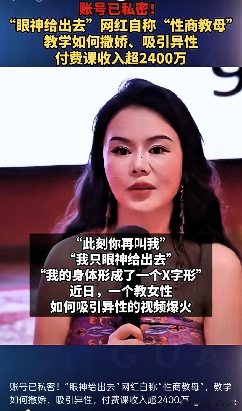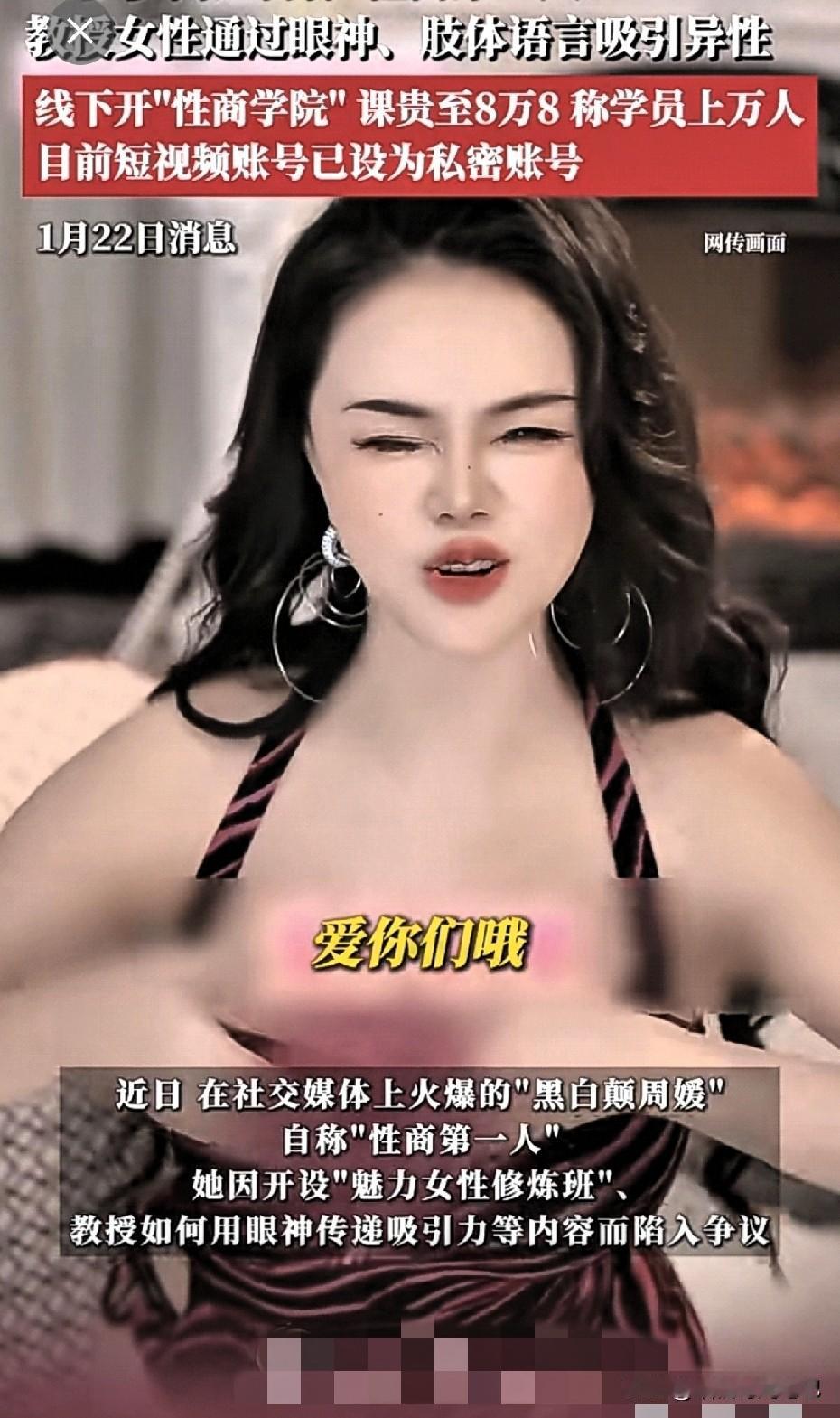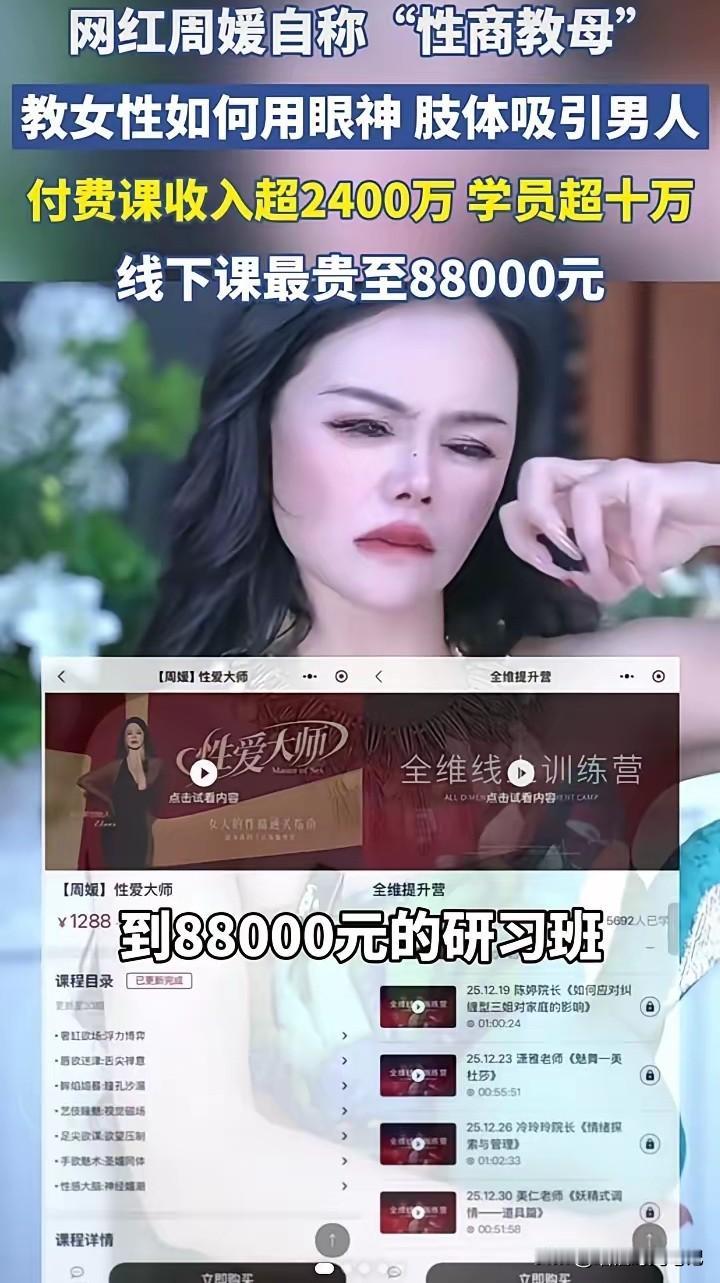 “X形回眸”你刷到过没?镜头里,一位五十岁的姐姐在线扭腰、挑眉、低声撒娇。当我听到那句“我只把眼神递出去”“现在你再喊我”……奶茶差点给屏幕洗个澡。 要是你最近也刷到这些台词,再配上挑眉、咬唇、摆胯的“眼神飙车”三连击,那大概率已经撞见自称“中国性商教母”的周媛。 短短几周,她靠短视频里夸张的肢体、魔性的口号,把“性商课”送上热搜,也把自家公司账户余额抬到2400万。 线下3天训练营4980元,导师班最高88000元,一个月排10场,场场爆满。 有人骂她是“3儿”教主,她回怼:老娘教的是取悦自己。 可转头商城里,同款润滑剂卖109,隔壁平台49,这到底是卖课还是卖货? 账号一封,徒留一地“X形身体”的剪影和2400万真金白银。 要我说,短视频平台需要流量,周媛提供了最现成的剧本;用户需要情绪出口,周媛递上最趁手的道具。可当模仿大赛结束,算法断粮后,留给学员的,是更真实的落差: “把眼神发射出去”那一刻,伴侣没回头; “让躯体钉成X”那一秒,房贷依旧要还。 这时候才发现,课程表里缺了一栏:如何靠自己建立长期稳定的自我价值感,而不是靠他人目光续命。 (图源网络)