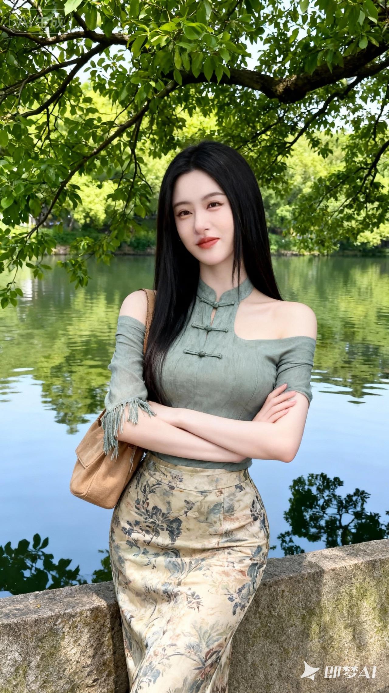 在绿意盎然的湖畔,她优雅地倚靠在石栏旁,仿佛一幅静谧的画卷。