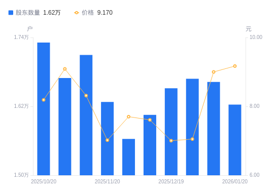 日期A股户数(户)流通A股户均持股数(股)户均持股市值(万元)2026-01-201623119916.8318.262026-01-091662619443.6417.502025-12-311668119379.5313.662025-12-191651619573.1413.712025-12-101605320137.6715.322025-11-281563320678.6915.922025-11-201627819859.3213.942025-11-101709618909.1015.722025-10-311669519363.2817.602025-10-201731218673.1715.29