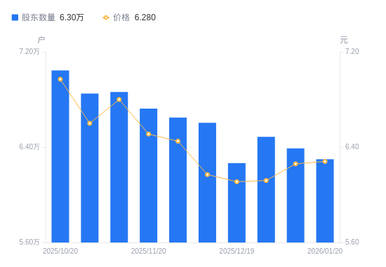 日期A股户数(户)流通A股户均持股数(股)户均持股市值(万元)2026-01-206298520042.1412.592026-01-096389819755.7712.372025-12-316486219462.1611.912025-12-196266420144.8112.312025-12-106605119111.8111.792025-11-286649118985.3412.252025-11-206723318775.8112.222025-11-106863818391.4812.512025-10-316850018428.5312.162025-10-207044617919.4612.49