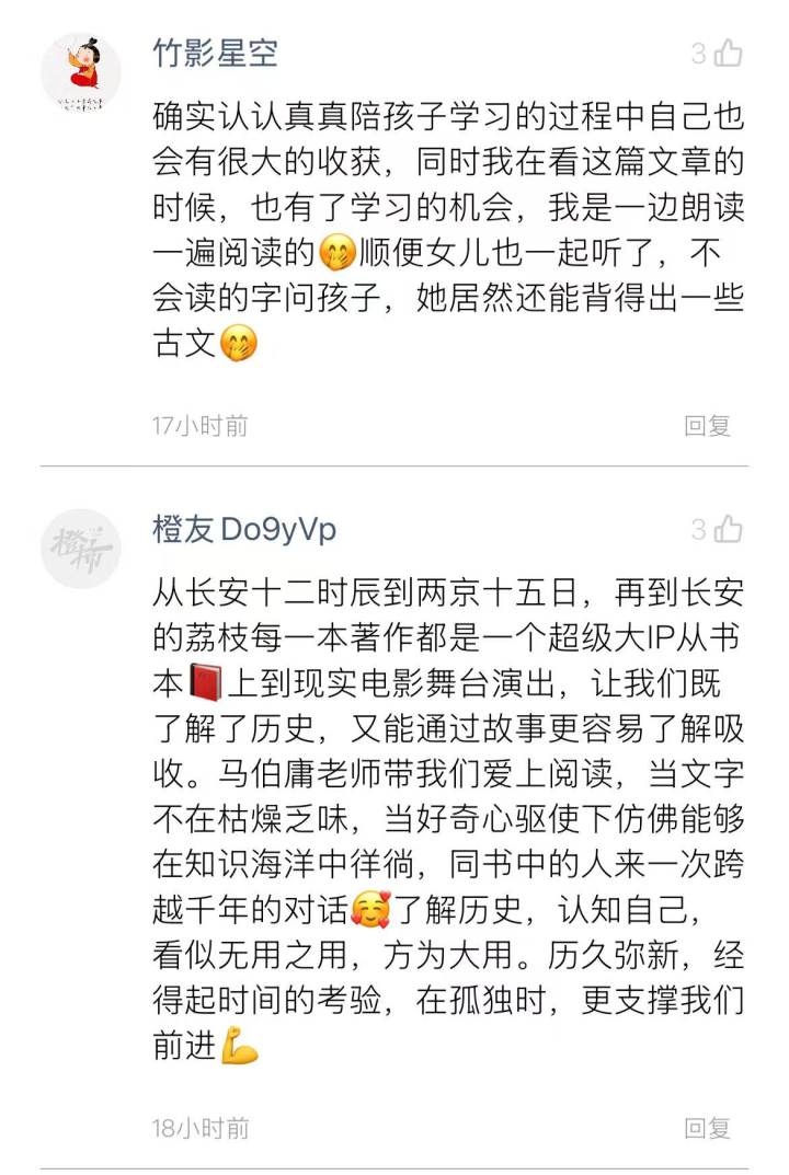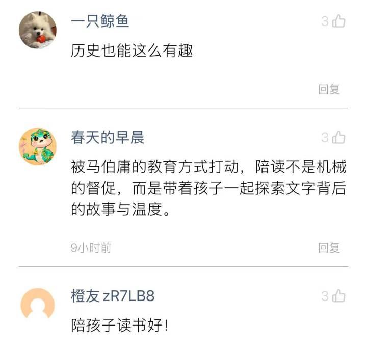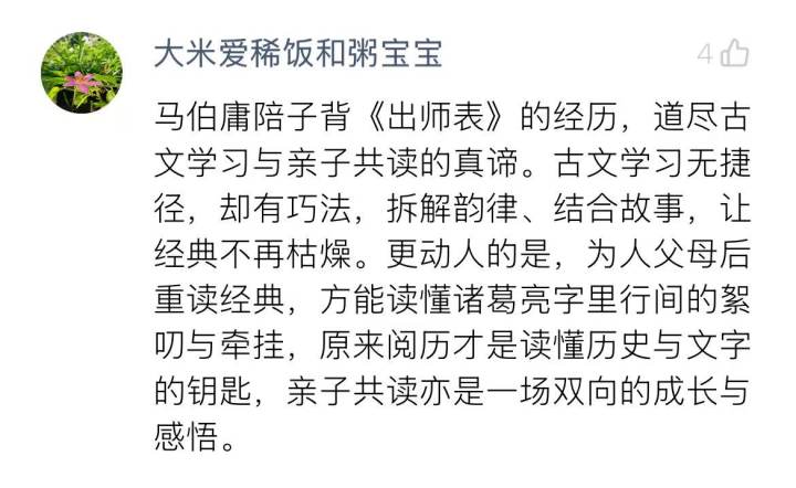 其中,一位名叫“大米爱稀饭和粥宝宝”的橙友留言,特别让人动容:“马伯庸陪子背《出师表》的经历,道尽古文学习与亲子共读的真谛。”