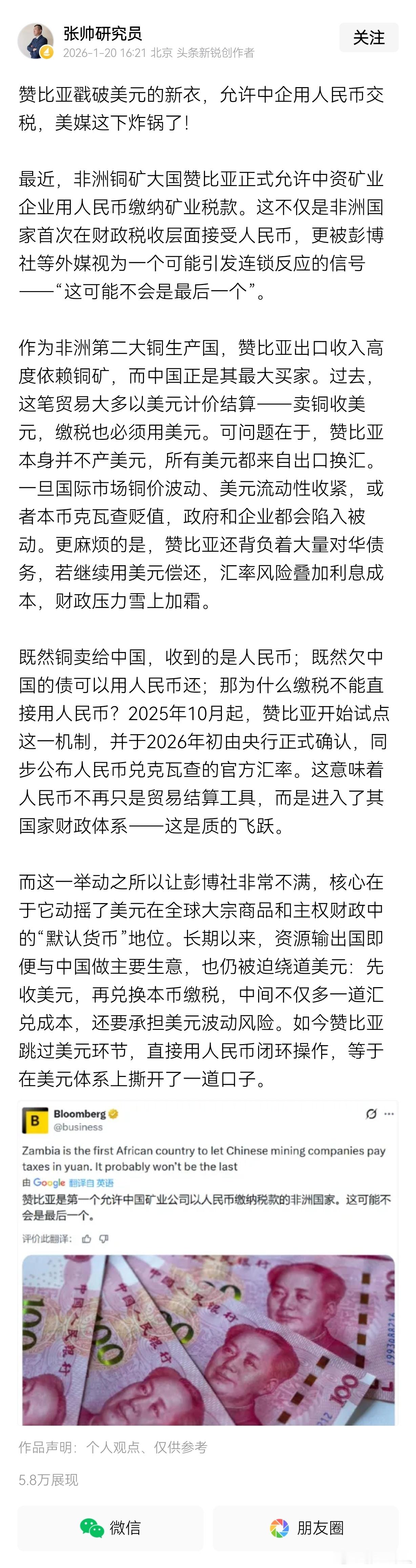 赞比亚戳破美元的新衣,允许中企用人民币交税,美媒这下炸锅了!最近,非洲铜矿大国赞比亚正式允许中资矿业企业用人民币缴纳矿业税款。这不仅是非洲国家首次在财政税收层面接受人民币,更被彭博社等外媒视为一个可能引发连锁反应的信号——“这可能不会是最后一个”。这个确实非常重要,对中国企业在国外运营很重要。后续中企都可以用人民币可以省去很多事情,因为矿产也是卖国内的。