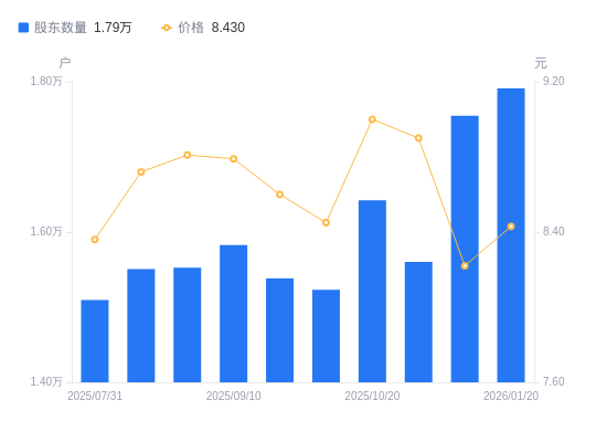 日期A股户数(户)流通A股户均持股数(股)户均持股市值(万元)2026-01-201791329092.5924.532025-12-191754729699.3924.412025-10-311560331103.0127.682025-10-201642229551.8326.602025-09-301523131862.6626.922025-09-191538131551.9227.132025-09-101582830660.8626.952025-08-201552531259.2627.542025-08-081550831293.5327.292025-07-311509432151.8526.88