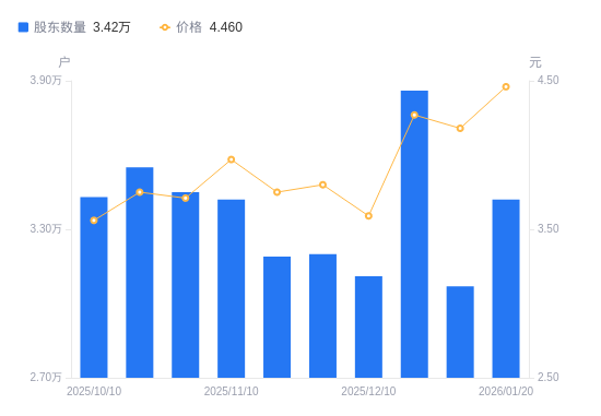 日期A股户数(户)流通A股户均持股数(股)户均持股市值(万元)2026-01-203420036037.1316.072026-01-103070040145.6016.782025-12-203860031929.2713.632025-12-103110039629.2614.232025-11-303200038514.6914.642025-11-203190038635.4214.492025-11-103420036037.1314.312025-10-313450035723.7713.252025-10-203550034717.4613.022025-10-103430035932.0712.79