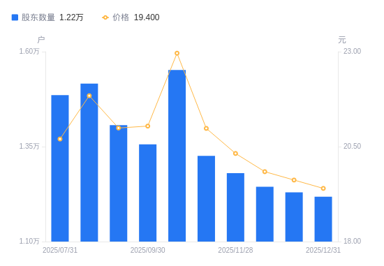 日期A股户数(户)流通A股户均持股数(股)户均持股市值(万元)2026-01-201239515278.9631.322025-12-311218315544.8330.162025-12-191229415404.4830.222025-12-101244415218.8030.192025-11-281280214793.2130.062025-11-201325714285.4929.972025-10-201551612205.6428.022025-09-301356213964.2229.382025-09-101406613463.8628.262025-08-081516112491.4427.28