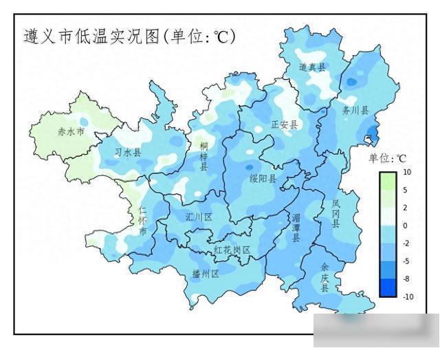 务川8乡镇、汇川13乡镇、正安18乡镇、绥阳15乡镇、道真13乡镇、桐梓22乡镇、凤冈13乡镇、余庆10乡镇、仁怀12乡镇、新蒲6乡镇、习水19乡镇、湄潭15乡镇、播州23乡镇、红花岗7乡镇、赤水1乡镇,最低气温为务川泥高-7.7℃。