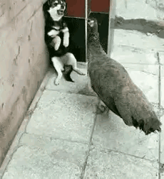 孔雀是很记仇的,雌孔雀亲眼目睹了狗狗咬死雄孔雀的恐怖过程,主人发现后狠狠地抽了狗狗一顿,并饿了它一个礼拜,从此后狗狗见了孔雀便绕路走,它知道,孔雀比它的地位高,狗狗惹不起。 孔雀也因此愈发得意,它不停地找机会修理狗狗,虽然它不是一只怂狗,但慑于主人的威胁,它只能做一只怂狗。 今天,孔雀又把狗狗逼入角落,并扬言:它随时可以剥了狗狗的皮,还要拔了狗狗的牙。 狗狗气得坐在地上狂吠,无论如何它都不能下口,否则,主人真的会剥了它的皮。