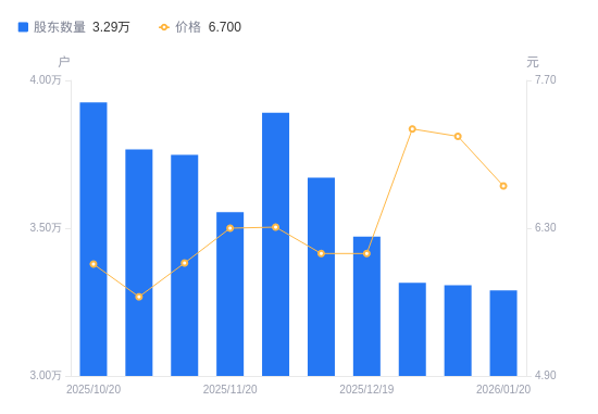 日期A股户数(户)流通A股户均持股数(股)户均持股市值(万元)2026-01-203289518602.4412.462026-01-093306818505.1213.272025-12-313315718455.4513.362025-12-193471917625.1410.682025-12-103671216668.3210.102025-11-283890315729.579.932025-11-203554117217.5010.852025-11-103748516324.599.752025-10-313766116248.309.182025-10-203925115590.119.29