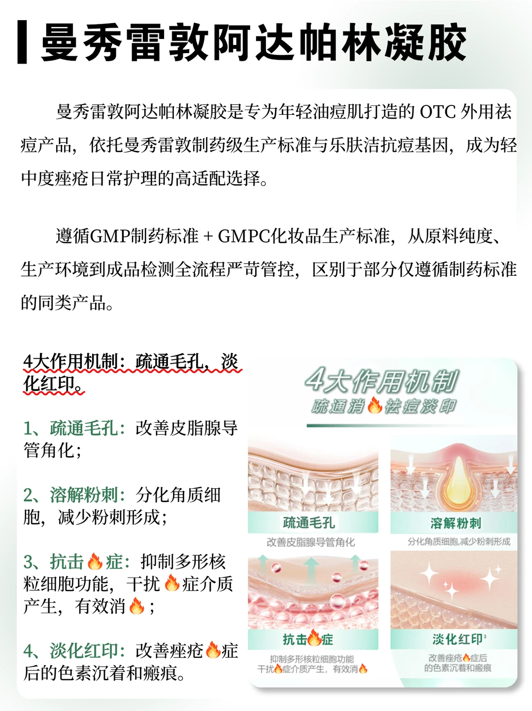 💖 曼秀雷敦阿达帕林凝胶是专为年轻油痘肌打造的 OTC 外用祛痘产品,依托曼秀雷敦制药级生产标准与乐肤洁抗痘基因,成为轻中度痤疮日常护理的高适配选择,精准把握了全链路祛痘的需求,为痘肌提供了系统化的护理新思路。