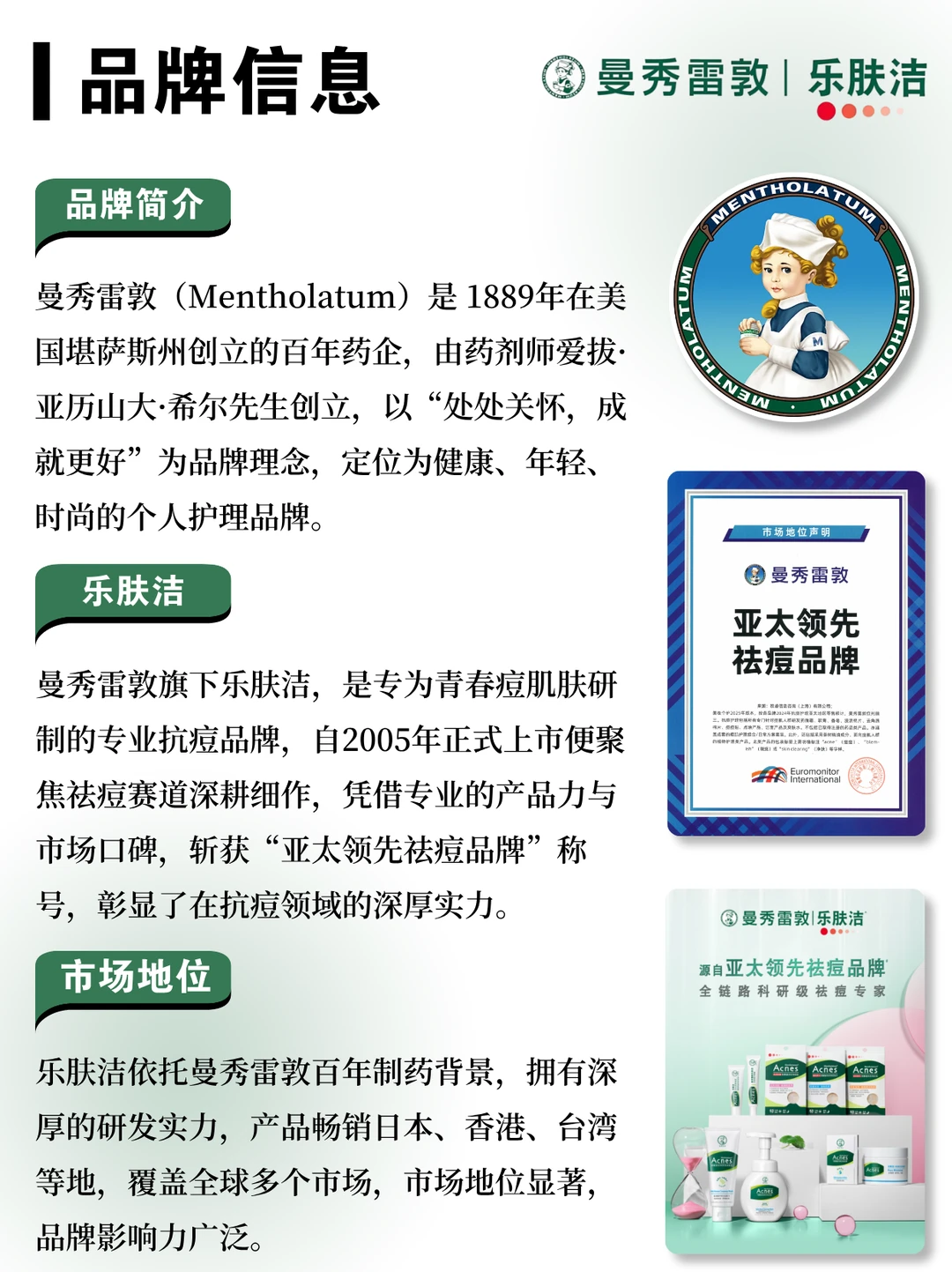 [赞R] 其旗下乐肤洁,是专为青春痘肌肤研制的专业抗痘品牌,自2005年正式上市便聚焦祛痘赛道深耕细作,凭借专业的产品力与市场口碑,斩获“亚太领先祛痘品牌”称号,彰显了在抗痘领域的深厚实力。