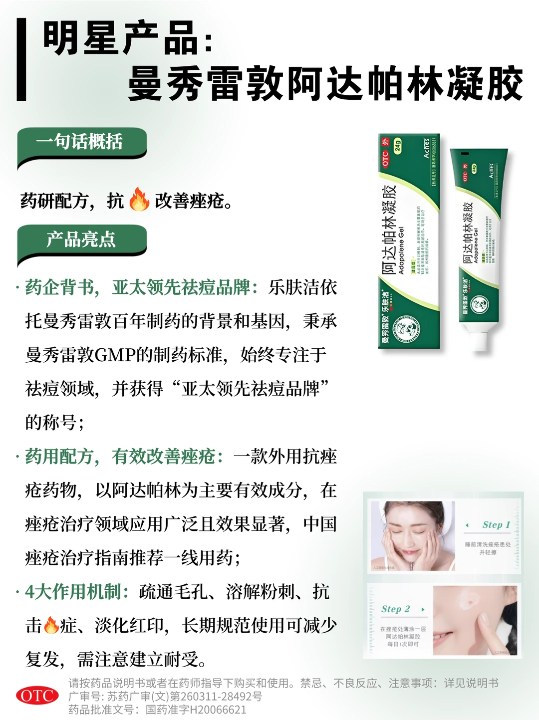 [火R] 2025年末曼秀雷敦推出全新明星产品:曼秀雷敦阿达帕林凝胶,以制药级标准打造,兼具合规性与实效性。该产品为外用抗痤疮OTC药品,核心有效成分为阿达帕林,该成分在痤疮治疗领域应用成熟、功效明确,且被《中国痤疮治疗指南》列为一线推荐用药,为产品的祛痘效果提供了权威依据。