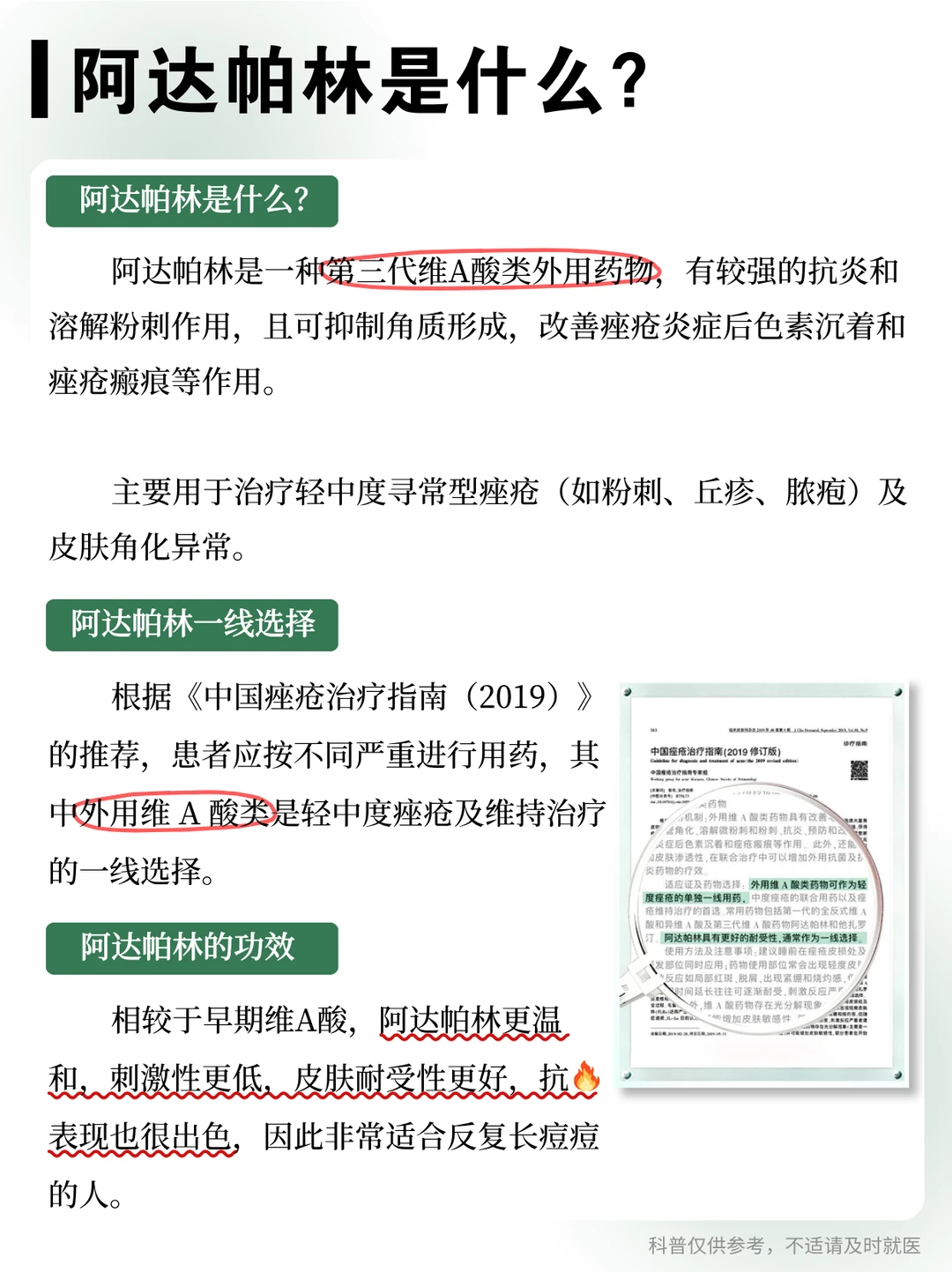 [二R] 科学药用配方,精准对症施策。以阿达帕林为主要有效成分,在痤疮治疗领域应用广泛且效果显著,是中国痤疮治疗指南推荐的一线用药。