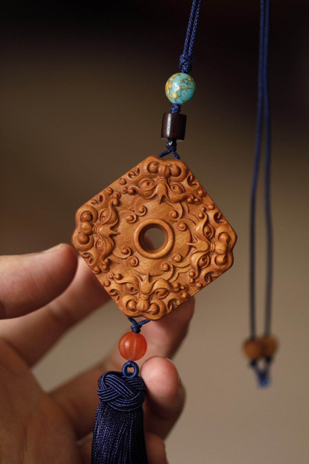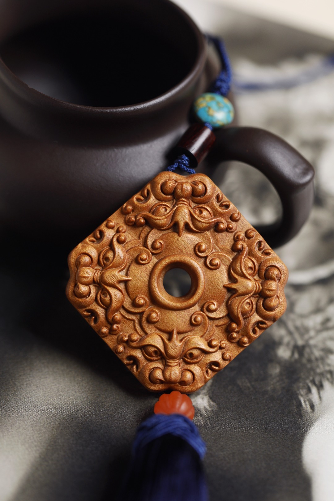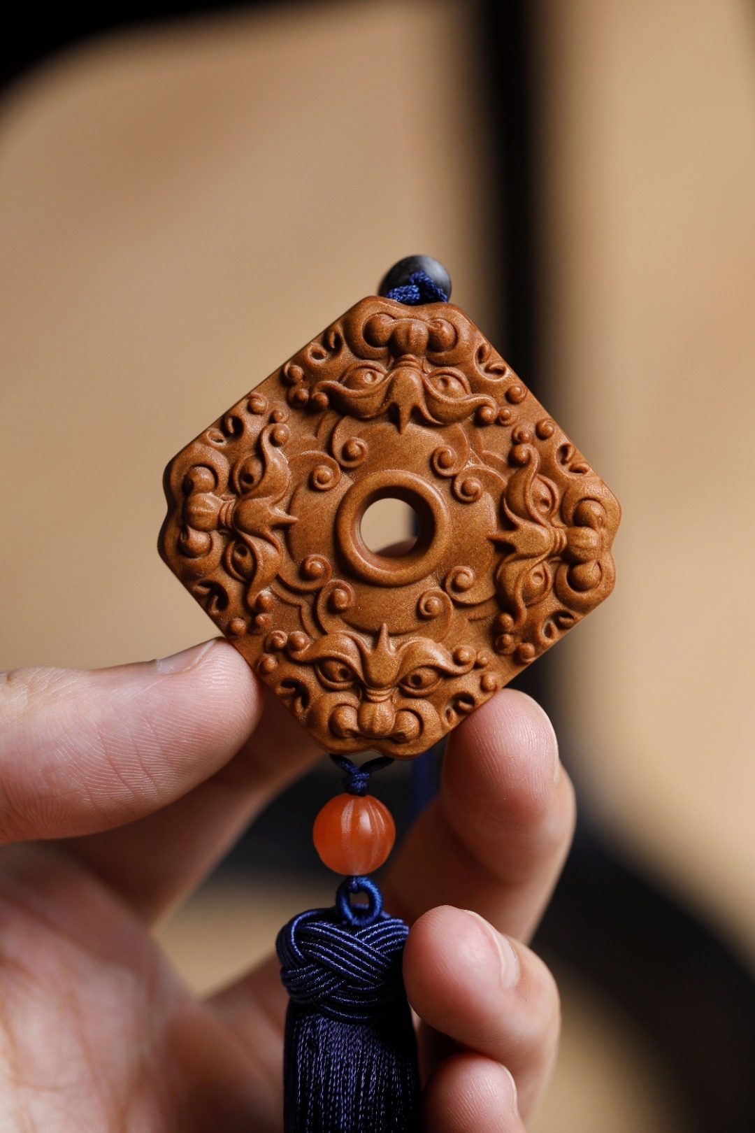 老山檀香 | 四方招财 挂件色泽典雅奶香味浓,素雅而不失精致,貔貅,招财神兽,寓意嘴大吃四方,配以宫廷流苏,贵气而不张扬,可车挂亦随身携带,步步生香。4.5*5.3*1cm 老山檀香 | 四方招财 挂件
