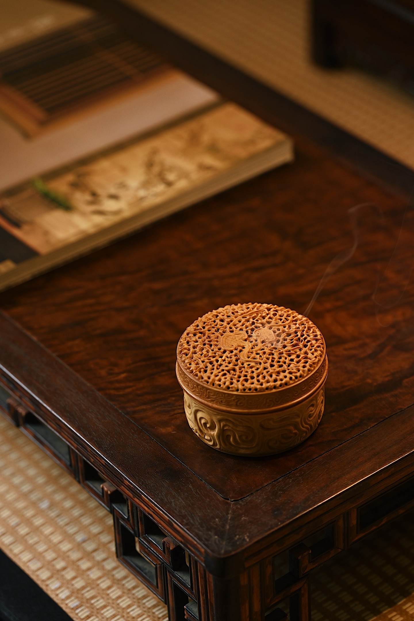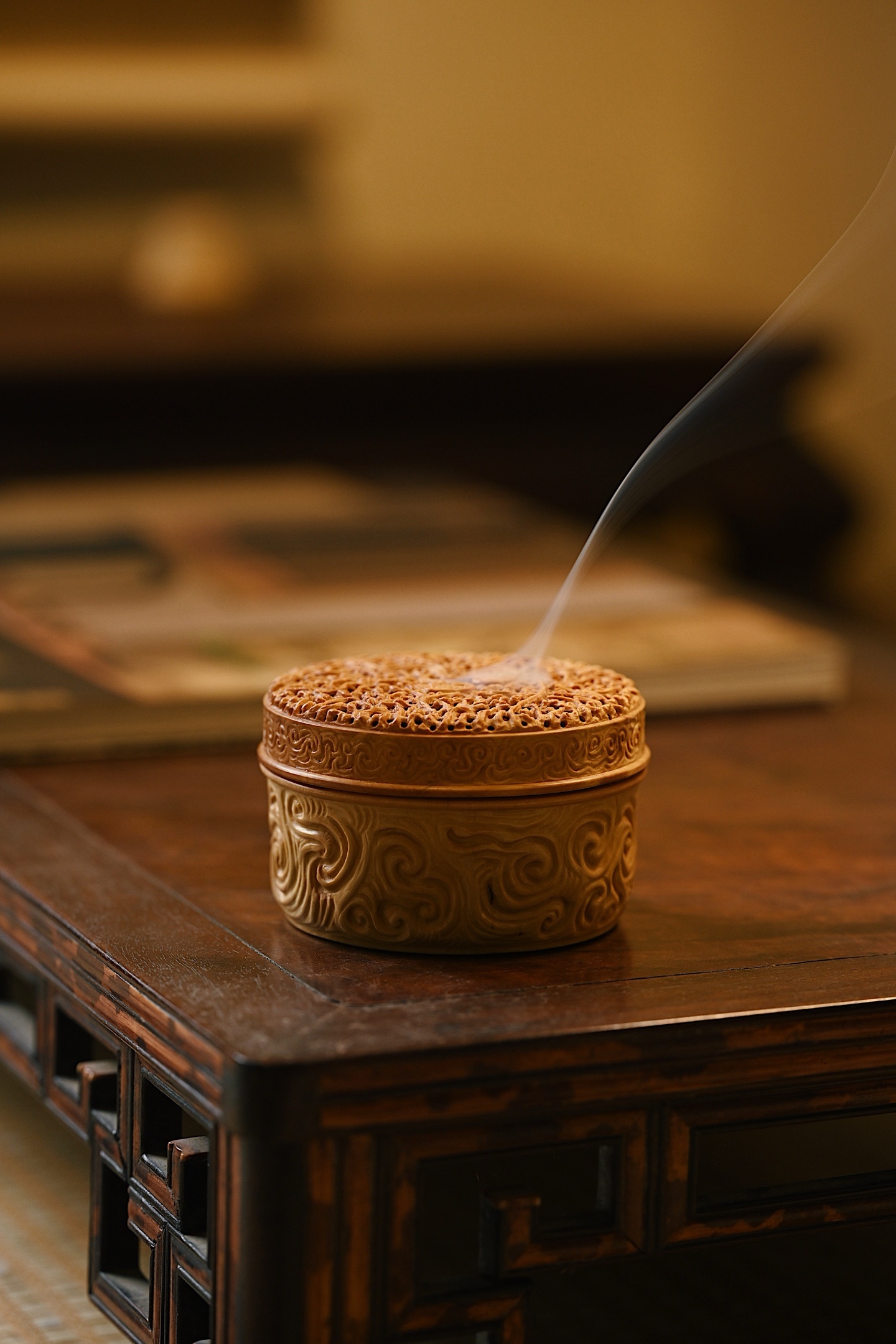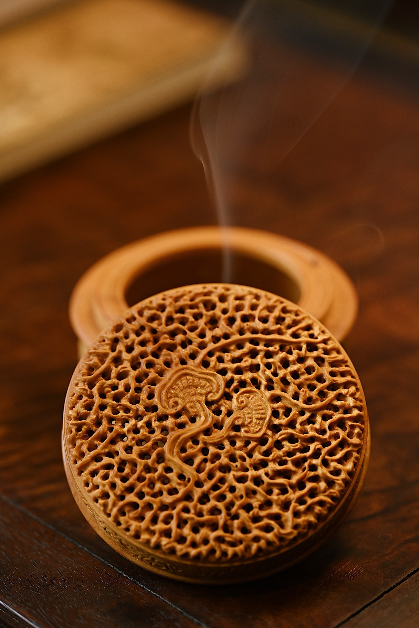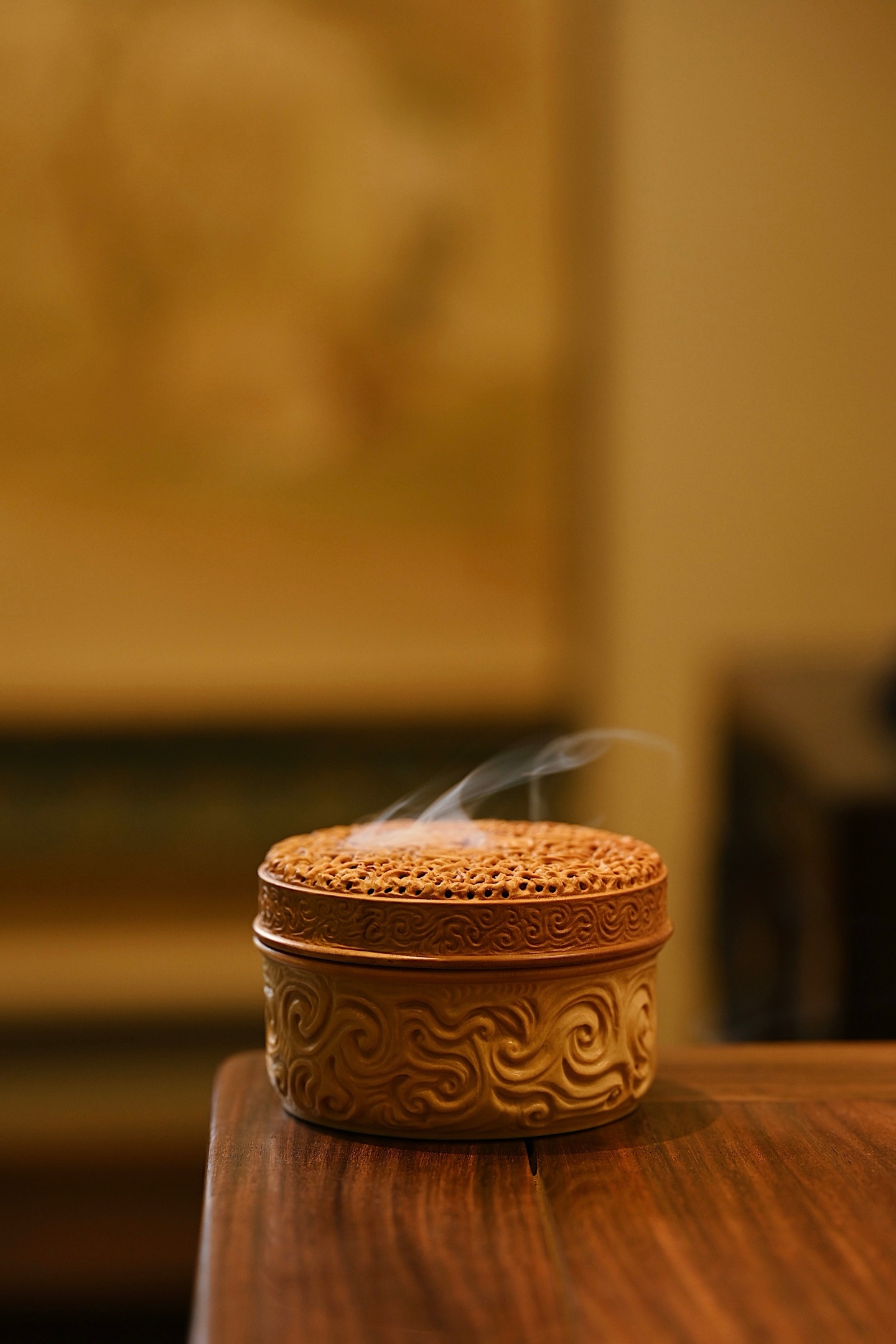 黄杨木 | 灵芝 香炉以黄杨木为材雕琢而成,木质细腻,色泽黄润,天然灵芝古朴雅致