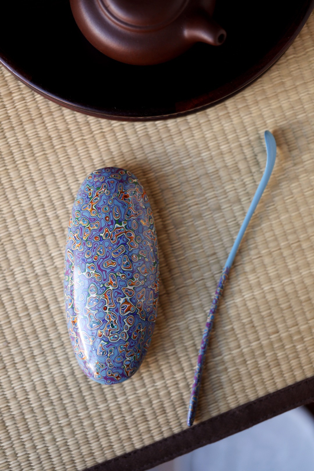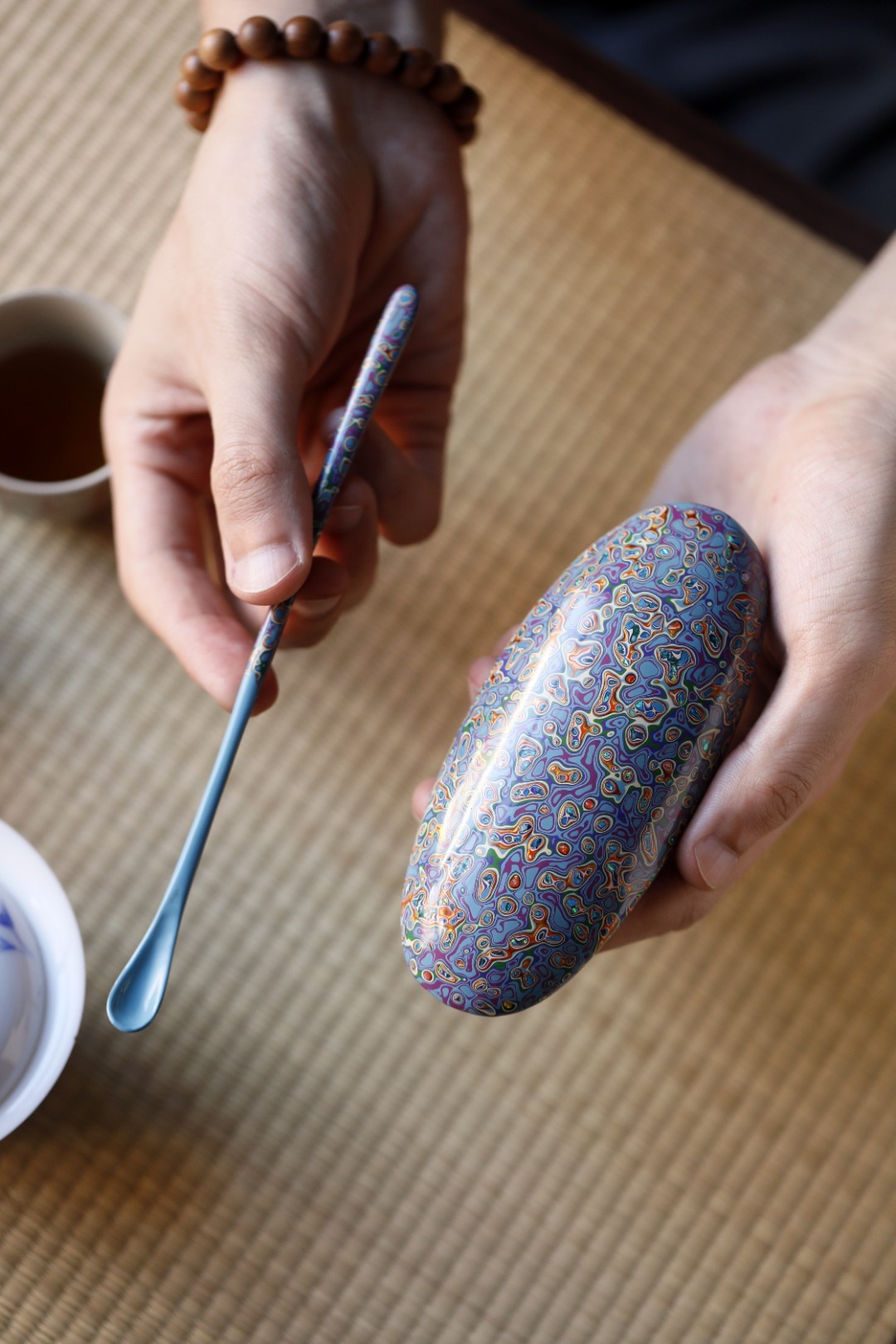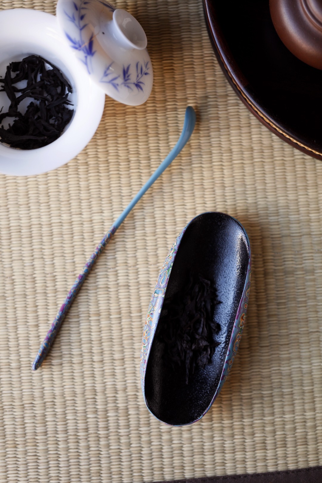 大漆【青橙】茶则紫光檀为底胚,裱麻布、刮灰、打磨、髹漆反反复复,历久弥新,人常抚之,茶水扑之,温润光泽,用之可修身养心。茶则:13*5.7*2.5cm茶勺:18cm 大漆【青橙】茶则