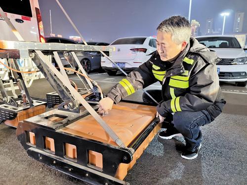 1月14日晚,石家庄市中山路,石家庄市城管局道桥设施管护中心检测维护所检测员曹岱正在对雷达检测设备进行调试。本报见习记者侯淼摄