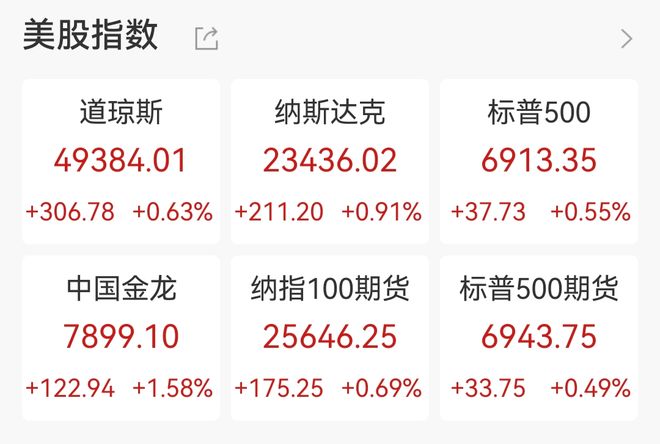1月23日,美股三大指数收盘集体上涨,道指涨0.63%,纳指涨0.91%,标普500指数涨0.55%。