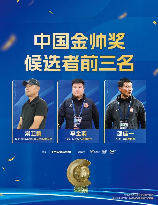 中国金帅奖前三名兼顾了中超、中甲和女足赛场:包括重振辽足的李金羽、开启中国男足执教生涯的邵佳一,以及将武汉车谷江大女足送上亚冠巅峰的常卫魏。回溯2025赛季,三人都在各自球队展现了值得信任的带队能力,既完成了竞技层面的赛季目标,也努力通过比赛内容展现自己的坚持与追求。