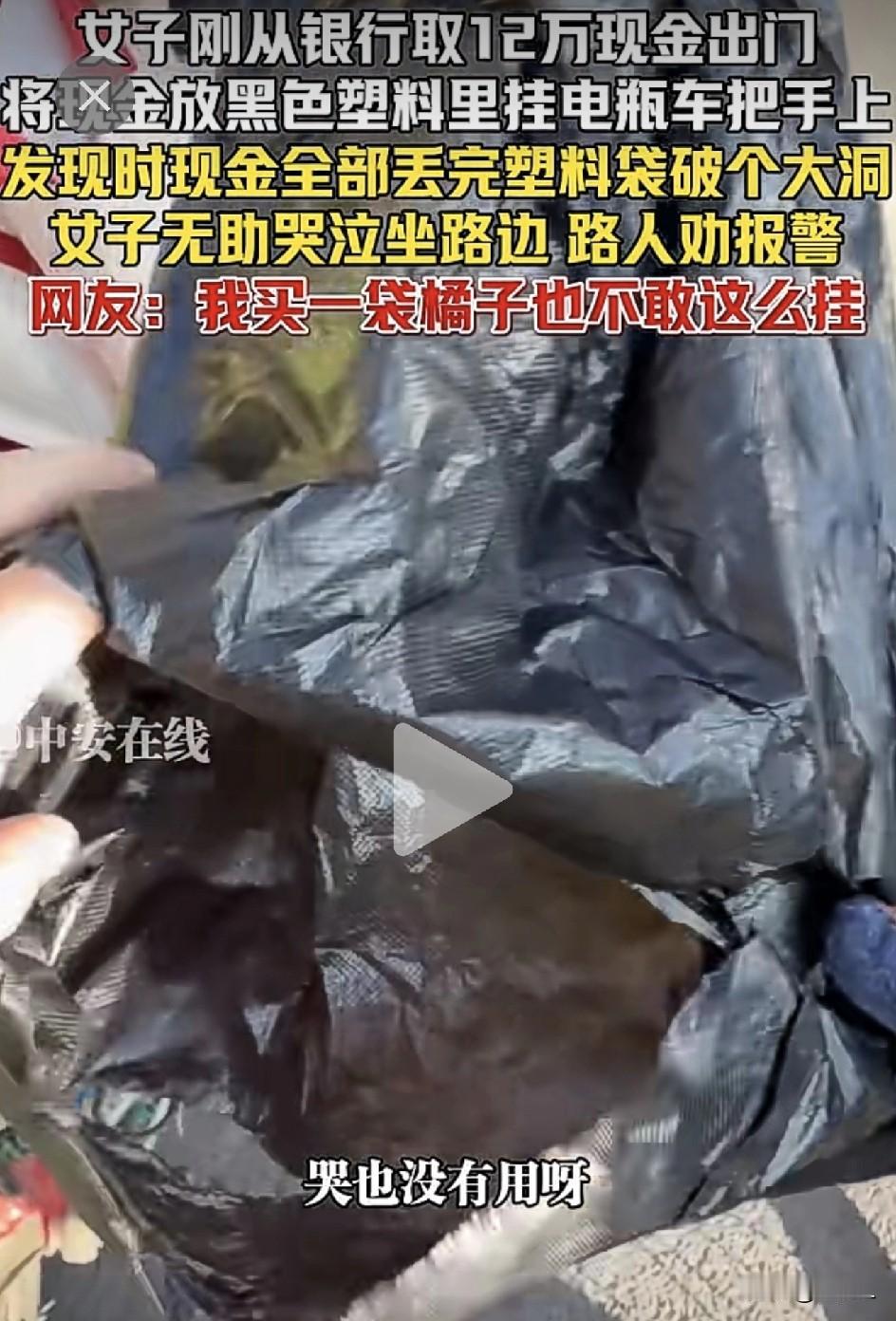 辽宁大姐取12万现金挂电动车头,结果塑料袋破洞全漏光!网友:我买袋橘子都不敢这么挂啊! 1月21日,辽宁街头发生一幕让人又心疼又着急的“撒钱大戏”。 一位大姐从银行取了12万元现金,顺手塞进黑色塑料袋,往电动车把手上一挂。结果路上袋子破了个大洞,钞票沿路漏光! 发现钱全丢了的大姐,坐在路边崩溃大哭,路人赶紧提醒:“快报警啊!” 视频里能看到,装钱的塑料袋破口明晃晃的,这哪是“普通塑料袋”,简直是“吞金兽”啊! 网友纷纷吐槽: “我买十块钱橘子都得套三层袋,这装12万居然单层裸奔?” “钱:谢邀,刚出银行就开启自由飞行模式✈️” “这要是被风吹走,捡到的人是不是得算中彩票?” 大姐这操作主打一个“心大”,这么大一笔钱还不配个布袋子吗?再说,取了这么一大笔钱,出门打车直接回家,安全才最重要啊! 目前最新消息:民警已介入帮忙寻找。有捡到钱的朋友请注意,这可不属于“意外所得”,赶紧交给警察叔叔! 年底取钱高峰,大家千万记住:现金不能“裸奔”,袋子务必“防漏”,电动车不是运钞车,捂紧钱包最稳妥! 大额取现最好两人同行,用牢固包具,直接打车回家!毕竟这世上没有“后悔路”,只有“安全路”呀~ 素材来源:中安在线,侵联删!