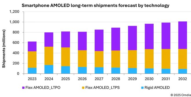 IT之家1月23日消息,市场研究机构Omdia昨日(1月22日)发布博文,预测2026年全球智能手机AMOLED面板出货量将终结连续三年的增长态势,降至8.1亿片;作为对比,2025年的出货量为8.17亿片。